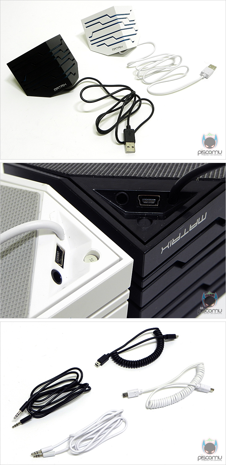 밑면은 대각선 방향으로 잘린 면적만큼 전체 고무패드를 적용해 미끄럼 방지를 해주도록 했습니다. 그리고 후면에는 나머지 하나인 전원케이블이 연결된 스피커와 연결할 수 있도록 mini-B 타입의 USB 포트가 지원되겠습니다. 나머지 스피커에는 전원 케이블로 USB방식을 지원하고 있으며, 포트부분에는 스피커끼리 연결해주는 mini-B 타입 포트와 함께 오디오와 연결되는 오디오 포트도 함께 확인할 수 있겠습니다. 그리고, 제공되는 케이블에는 스피커끼리 연결해주는 mini-B 타입의 USB 케이블과 약 1.2m 길이를 가진 오디오 케이블이 지원되겠습니다. 특히, 스피커 연결 USB 케이블은 코일형태를 갖추고 있는게 눈에 띕니다.