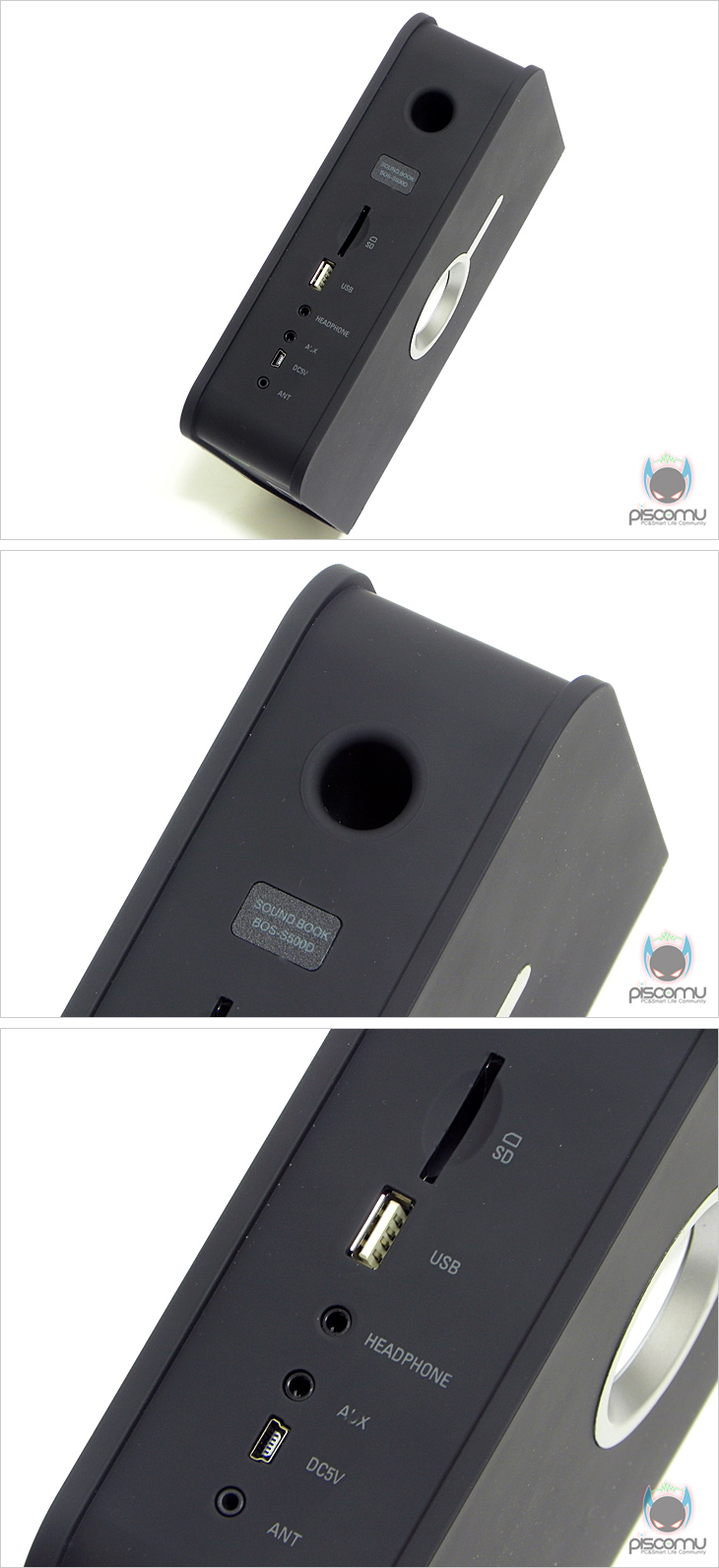 이제, BOS-S500D SoundBook을 살펴보겠습니다. 제품의 전체적인 색상은 블랙이며, 디자인은 모델명처럼 책을 연상케 하는 디자인을 가졌습니다. 이전, BOS-S300D는 그래도 우퍼가 노출되어 있어 스피커라는 인식을 가질 수 있었던 반면, 이번 BOS-S500D SoundBook은 기존의 스피커 디자인 틀을 완전히 벗어난 새로운 디자인의 혁명을 느낄 수 있습니다. 크기는 한 손에 들고 다닐 수 있는 책 크기 정도로, 좀 더 쉽게 언급하면 8인치 타블렛PC 크기 정도가 되겠습니다. 두께는 오히려 책보다 두꺼워서 무게감도 있을 것 같지만, 무게는 1kg의 절반도 안 되는 약 425g를 가지고 있어 가벼운 편입니다. 전면에는 이번 제품에 합작인 디자인부분에 sadi(삼성디자인학교)와 제조사 보노보스 명이 새겨져 있으며, 내부 2개의 드라이버 유닛으로 출력되는 사운드를 외부로 출력되게 에어홀 디자인을 적용했습니다.