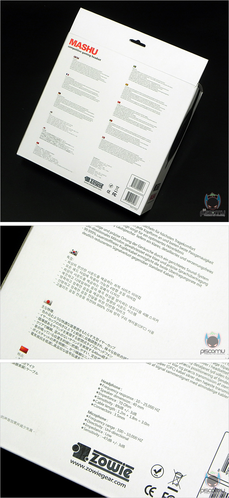 MASHU의 제품 박스 디자인은 심플한 편입니다. 헤드셋 색상이 블랙이라 박스 배경색은 화이트색상이며, 제품의 이어(EAR)부분 디자인을 삽입해 제품의 생김새를 간접적으로 파악할 수 있습니다. 박스 후면에는 총 11개 나라의 언어로 제품 소개를 하고 있는데, Zowie Gear 마케팅은 한국에서 맡고 있어, 한국어 역시 기본 포함이 되어 있습니다. 총 7가지 특징을 언급하겠습니다. 그리고, 제품의 기본 스펙 정보도 확인을 할 수 있어, 구입에 도움이 되겠습니다. 제품 포장은 해당 제품의 크기에 맞춤 포장식이며, 제품 구성은 헤드셋과 연장 케이블로 간단하게 이루어져 있습니다.