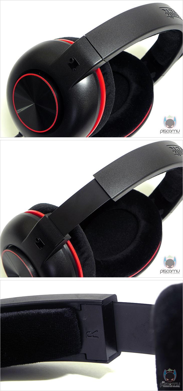MASHU를 살펴보면, 전체적인 색상은 블랙이며, 헤어밴드 부분 외부 중앙 위치에는 제조사 로고가 새겨져 있습니다. 그리고, 밴드 안쪽 착용부분에는 편안한 착용감을 위해 푹신한 쿠션처리를 적용했습니다. 표면 재질은 스웨이드 재질입니다. 그리고, 사람의 머리 크기에 따라 착용감 조절을 할 수 있게 양쪽 이어(EAR)의 밴드 길이 조절도 지원을 해주는데, 최대 5cm까지 길이를 늘릴 수 있습니다. 그리고, 좌우 구분 표기는 안쪽에 처리가 되어 있습니다. 왼쪽 이어(EAR)패드에는 마이크가 적용되어 있는데, 사용하지 않을 시에는 수직까지 올려 세울 수 있고, 최대 약 120°가량정도 각도조절이 가능해 역시 착용하는 사람에 따라 마이크 각도 조절을 할 수 있습니다. 또한, 마이크는 단일지향성마이크로 주변 잡음을 담지 않아 상대방에서 정확한 음성을 들려주겠습니다.