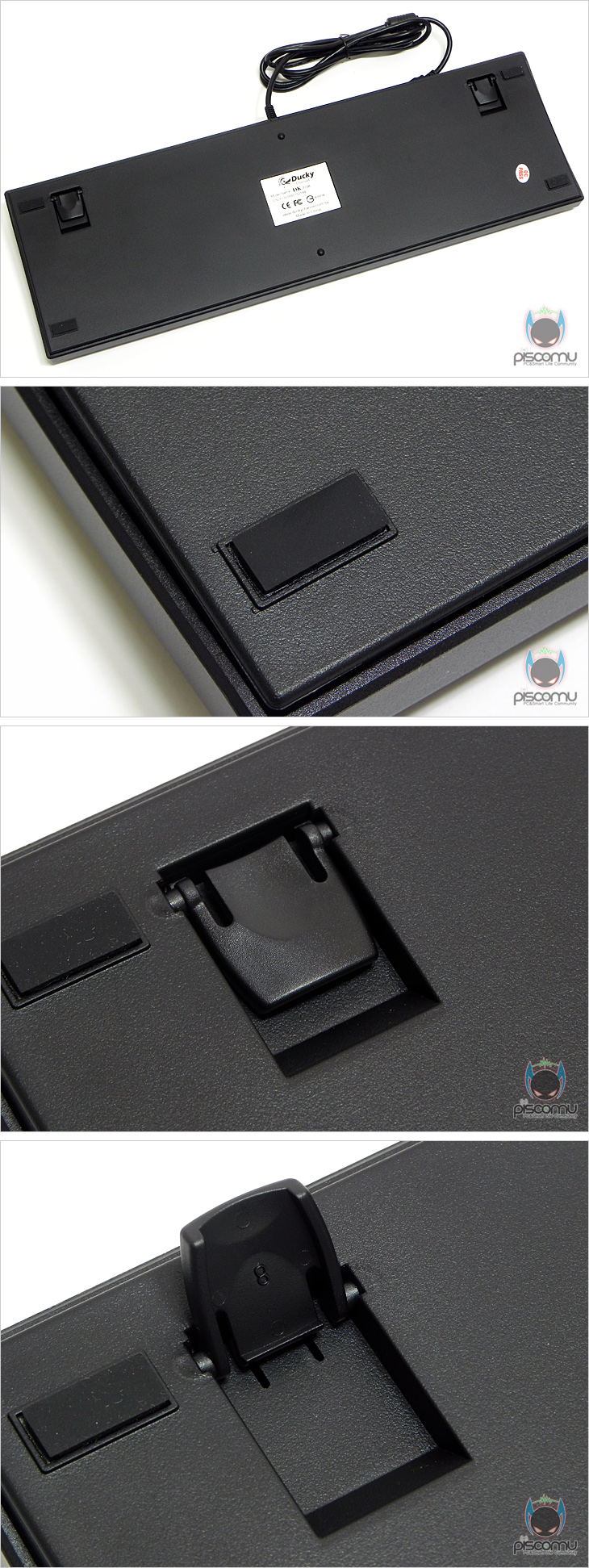 DK2108을 살펴보면, 기존의 모델들과 달리 기본에 충실했다라는 느낌을 디자인을 통해서 바로 느낄 수 있습니다. 그리고, DK2108은 ZERO Series에서도 기본 모델이기 때문에 LED 백라이트 지원이 없습니다. 키 배열은 풀 배열을 가지고 있습니다. 부분적으로 좀 더 살펴보면, 스페이스 바 기준으로 왼쪽 윈도우 키(Windows Key)에는 윈도우 로고가 아닌 제조사 로고(Logo)가 새겨져 있으며, 스페이스 바에도, 브랜드명이 새겨져 있습니다. 그리고, 오른쪽에는 Fn(펑션)키가 배치되어, 앞서 설명서에서 확인한, F10키와 F12키와 함께 조합해 윈도우 키 잠금/해제(Windows Key Lock/Unlock), 무한 동시 입력 지원(N-Key Rollover) 기능을 사용할 수 있습니다. 그리고, 숫자키 패드 윗부분에는 부가 기능키로 음소거(Mute), 볼륨 조절 키와 윈도우 계산기 실행 키가 배치되어 있습니다. 키 킵에 문자 인쇄를 레이저 프린팅(Laser-printing)으로 오랜 타이핑에도 쉽게 벗겨지지 않도록 했으며, 제공되는 키 캡 리무버 장치로 쉽게 키 캡을 분리할 수 있습니다. 키 스위치는 갈축(Brown)으로 스위치 제조사는 현재 기계식 키보드에 많이 사용되는 독일의 체리사 MX(Cherry MX)시리즈가 적용되었습니다. 갈축은 키감은 청축과 비슷하지만, 실제 압력은 적축과 동일하며, 소타이핑 시 소음을 청축보다 줄인 것이 특징입니다. 이 밖에, 제공되는 레드(Red) 색상의 WASD 키 캡을 게이밍 모드에서 사용하면 좀 더 키의 위치 인식을 빨리 가질 수 있겠습니다. DK2108이 기본 모델이라 모든 키에 LED 백라이트가 지원되지 않지만, 기본적으로 LED가 적용된 부분도 있습니다. Caps Lock 키(Key), F10 키, F12 키, Scroll Lock 키, Mum Lock 키에는 동작 상태확인을 위해 LED가 적용되어 있습니다. 키보드 밑면을 살펴보면, 각 모서리 부근에는 미끄럼 방지를 위해 고무 패드를 기본 적용했으며, 앞자리는 기본 높이 외에 추가로 높이를 올릴 수 있게 높낮이 받침대가 적용되어 있습니다. 받침대를 사용하게 되면, 앞자리 높이가 약 10mm 정도 올라가게 되면서 경사도 약 5°정도 올라가겠습니다. 그리고, 측면에서 키 배열을 보면, 타이핑이 최적이라 할 수 있는, 스텝 스컬처(Step-scalpture)로 배열이 되어있습니다. 끝으로, 케이블을 살펴보면, 이전까지의 모델들은 분리형 케이블을 사용했지만, 이번 ZERO Series는 일반 키보드와 마찬가지로 연결형태인 케이블로 적용되어 있습니다. 길이는 약 1.8m로 유선으로 충분한 길이를 가졌으며, USB 인터페이스 연결 방식으로 신호 손실 최소화를 위해 노이즈 필터로 적용이 되어 있습니다.