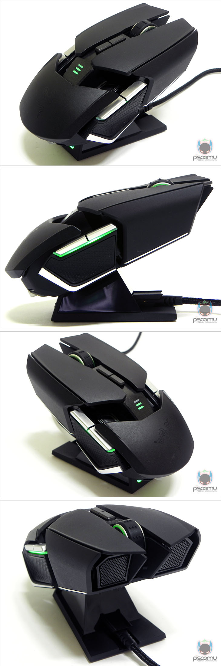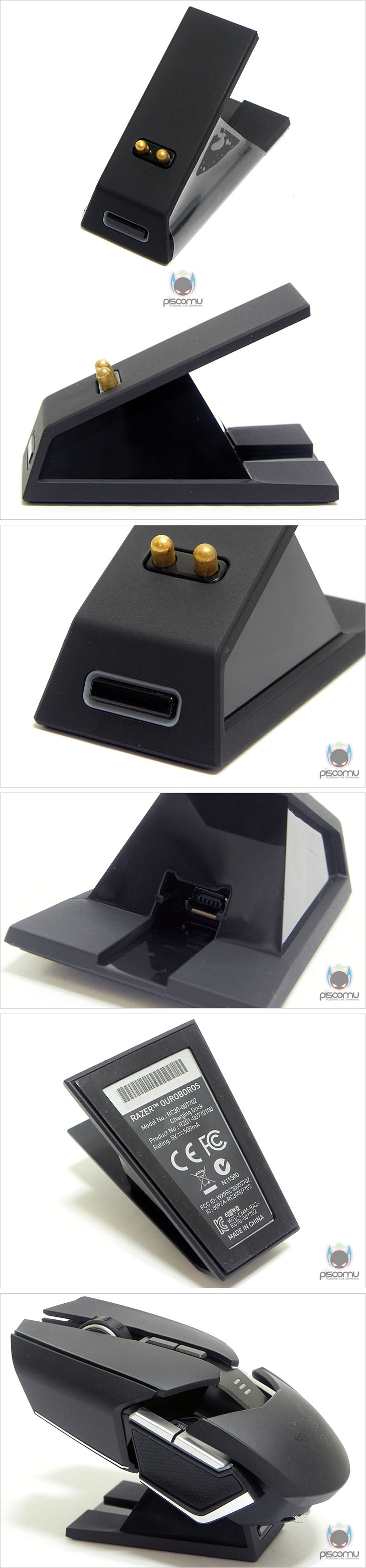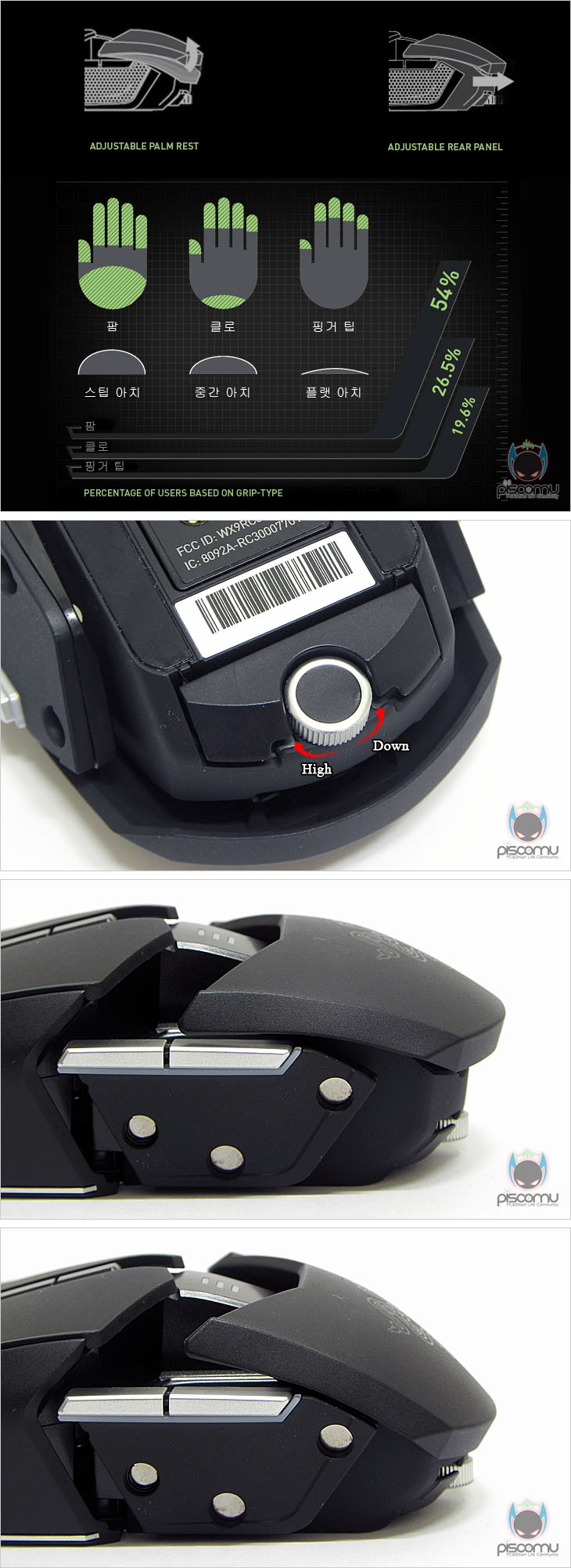 마우스 전면에는 메쉬(타공망) 처리가 되어 있으며, 가운데 휠-버튼 아래에는 제공되는 USB 케이블과 연결되는 USB 포트를 확인할 수 있습니다. 후면에는 마우스 손바닥 그립 부분이 팜-레스트 높낮이 조절을 할 수 있는 스크류를 확인할 수 있습니다. 우로보로스(Ouroboros)의 또 하나의 특징은 그립 유형에 따라 팜레스트 높낮이와 길이 조절을 할 수 있다라는 점인데, 일단, 높낮이 경우 후면 밑부분에 배치된 스크류를 좌우로 최대 약 14번 반바퀴 정도 돌리면서 팜-레스트 높낮이를 조절할 수 있습니다. 손바닥 그립 비중이 높은 팜-그립일 경우엔 높게, 손가락 비중이 높은 핑거-그립에선 낮게 설정을 하면 됩니다. 또한, 높낮이 조절과 동시에 그립 유형에 따라 팜-레스트의 앞뒤 길이 조절도 가능한데, 높낮이 조절 스크류 주변부를 눌러주면, 팜-레스트 길이를 최대 5단계로 길이 조절할 수 있습니다. 기본 길이에서 최대 16mm까지 늘어납니다. 즉, 높낮이와 길이 조절을 자신의 그립 유형에 따라 최적으로 맞춰 설정할 수 있겠습니다. 그리고, 팜-레스트를 분리했을 때, 무선 사용을 위한 충전지 삽입구를 확인할 수 있는데, 제공되는 AA건전지를 사용하면 무선으로 사용할 수 있습니다. 제공되는 AA건전지는 충전지로 용량은 2500mAh로 일반 충전지 용량에 비해 많은 편이며, 한 번 충전으로 최대 12시간 사용이 가능하겠습니다. 물론, 동일한 배터리타입의 일반 충전지도 사용이 가능합니다. 마우스 밑면에는 앞부분과 가운데 양쪽 자리에 부드러운 움직임을 위해 기본 테프론 피트를 부착해놨으며, 앞부분 피트 바로 아래에는 좌우 측면 버튼 인식을 잠금 해제 할 수 있는 스위치가 배치되어 있습니다. 그리고, 가운데는 레이저 센서로 2개의 센서가 적용된 듀얼 센서를 갖추고 있습니다. 이미 여러 리뷰에서 알려진 대로, 센서는 Avago사의 ADNS-9800 센서를 레이저 마우스 전용으로 변형한 4G 센서로 최대 8200DPI를 지원합니다. 그리고, 센서 아래에는 충전 도크와 연결되는 접지 부분이 배치되어 있습니다. 끝으로, 무선 사용시 리시버 역할과 충전지 충전시 거치대 역할을 하는 충전도크를 살펴보면, 약 30° 경사를 가진 거치대 형태로 충전 시 마우스 밑면의 접지부분과 접촉되는 거치대 접지를 확인할 수 있으며, 바로 전면에는 리시버 상태를 확인할 수 있는 LED 램프가 배치되어 있습니다. 그리고, 후면에는 USB 전원케이블과 연결되는 USB 포트를 확인할 수 있습니다. 그리고, 미끄럼방지를 위해 밑면에는 고무패드가 부착되어 있겠습니다. 유선 사용시와 충전도크 연결시 사용되는 USB전원케이블의 길이는 2m로 충분한 길이를 가지고 있으며, 케이블 전체는 깔끔하게 슬리빙 처리가 되어 있습니다. 또한, 양쪽 USB 포트부분에는 신호손실을 최소화하기 위해 금도금 처리가 되어 있으며, PC 장치와 연결되는 기본형 USB 포트에는 덮개가 제공됩니다.