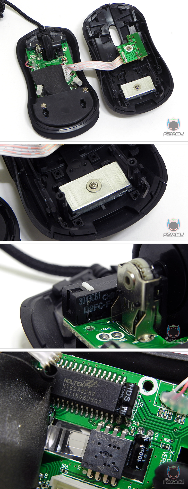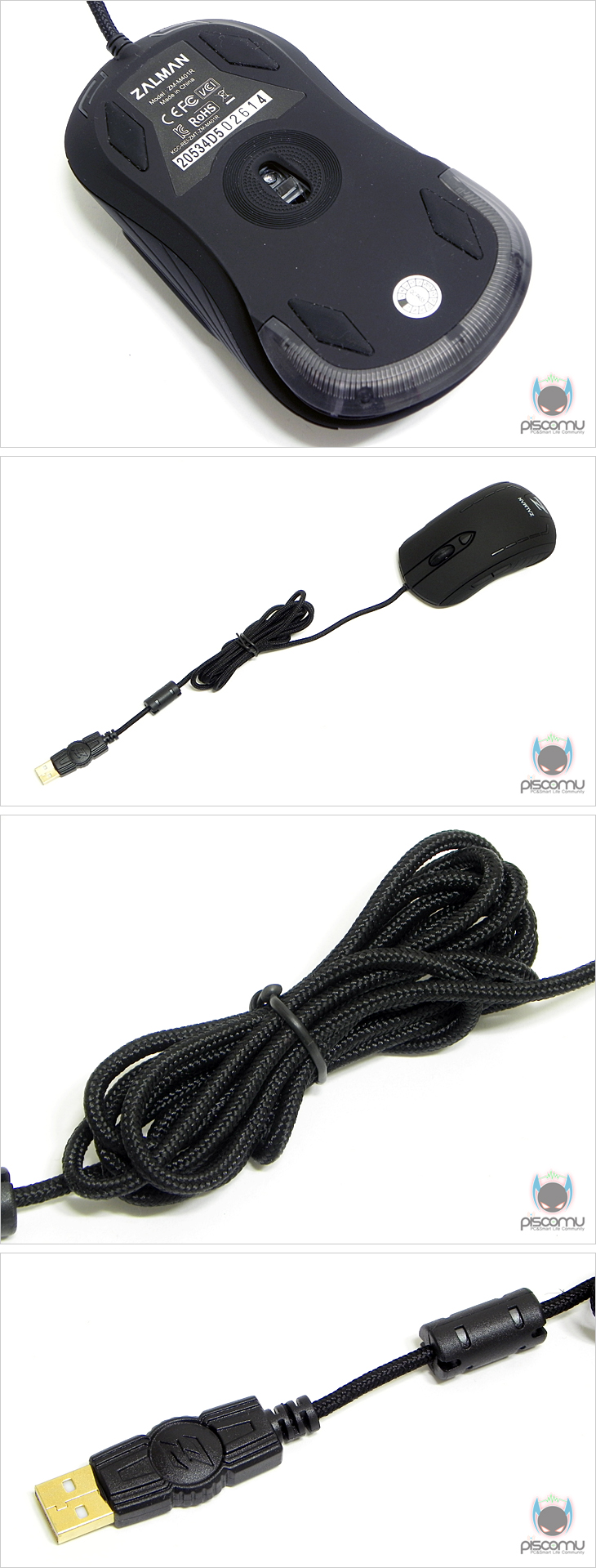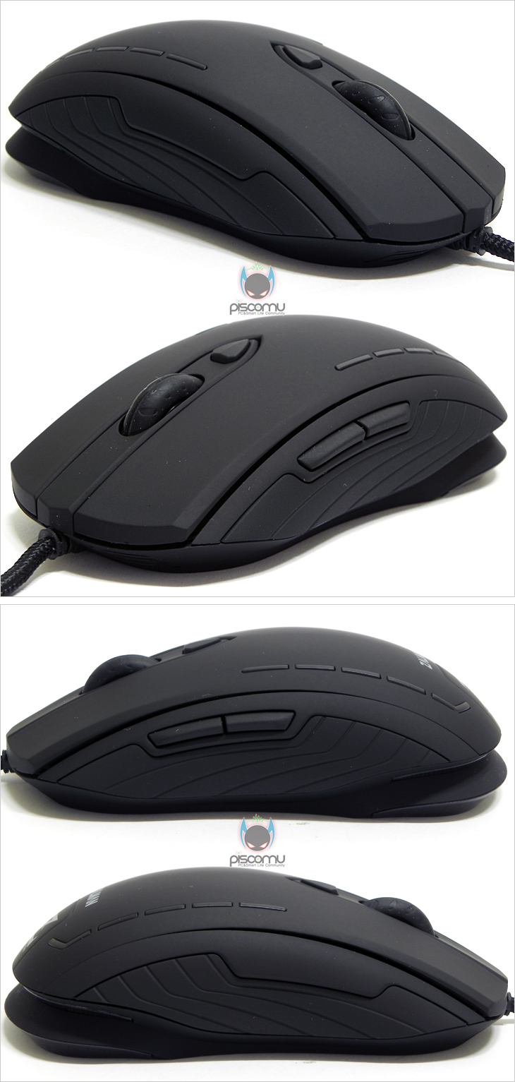 ZM-M401 레볼루션을 살펴보면, 전체적인 색상은 블랙을 가졌으며, 상판 커버는 모두 러버(고무) 코팅으로 처리가 되어 있습니다. 앞부분의 기본 좌우 버튼을 비롯해 가운데 휠-버튼 역시 러버 재질을 사용해 접지력을 높여 스크롤 정확성을 높였습니다. 휠-버튼 뒤에는 DPI 변경 버튼이 배치되어 있는데, 1000/1500/2000//2500순으로 500단위로 변경되겠습니다. 그리고, 마우스 전면에는 LED효과를 볼 수 있게 처리가 되어 있습니다. 손바닥 부분의 팜-레스트에는 끝부분에 제조사와 브랜드 로고가 새겨져 있으며, 양쪽에는 라인 형태로 디자인 처리가 되어 있는데, 작동 시 역시 LED효과를 볼 수 있는 곳으로 DPI값에 따른 각기 다른 색상의 LED를 표기해줍니다. 또한, 후면은 2단 형태의 디자인으로 되어 있는데, 역시 LED효과를 볼 수 있도록 처리가 되어 있습니다. 마우스 측면을 보면 높이가 낮은 편으로 슬림한 형태임을 알 수 있어 게이밍과 일반 사용 모두 적절하게 사용할 수 있도록 했습니다. 또한 측면 디자인은 패턴 라인형태로 처리가 되어 있으며, 좌측에는 추가 버튼 지원으로 2개의 버튼이 배치되어 있는데, 웹-페이지 앞/뒤 기능이 되겠습니다. 마우스 밑면에는 부드러운 움직임을 위해 앞뒤 자리에 각각 테프론 피트를 기본 부착했습니다. 그리고, 케이블 지원에서 케이블은 깔끔하게 패브릭 재질로 전체 슬리빙 처리를 했으며, 길이는 약 1.7m로 유선으로 충분한 길이를 가졌습니다. 연결 인터페이스는 USB 방식으로 전송제어 속도는 스펙에서 언급했듯 500Hz를 가지고 있습니다. 또한, 신호손실 최소화를 위해 노이즈 필터와 포트부분에 금도금 처리를 했습니다. 끝으로 ZM-M401 레볼루션의 내부를 잠깐 살펴보면, 손바닥 팜레스트 부분의 내부에는 무게추가 적용된 것을 확인할 수 있는데, 무게는 약 19g 입니다. 기본 버튼의 스위치는 옴론(OMRON)사 스위치이며, 센서는 박스에 표기했듯, PixArt ADNS-5050 센서를 적용했으며, 컨트롤러 칩에는 HOLTEK사의 칩(HT82A525R)이 적용된 것을 확인할 수 있겠습니다.