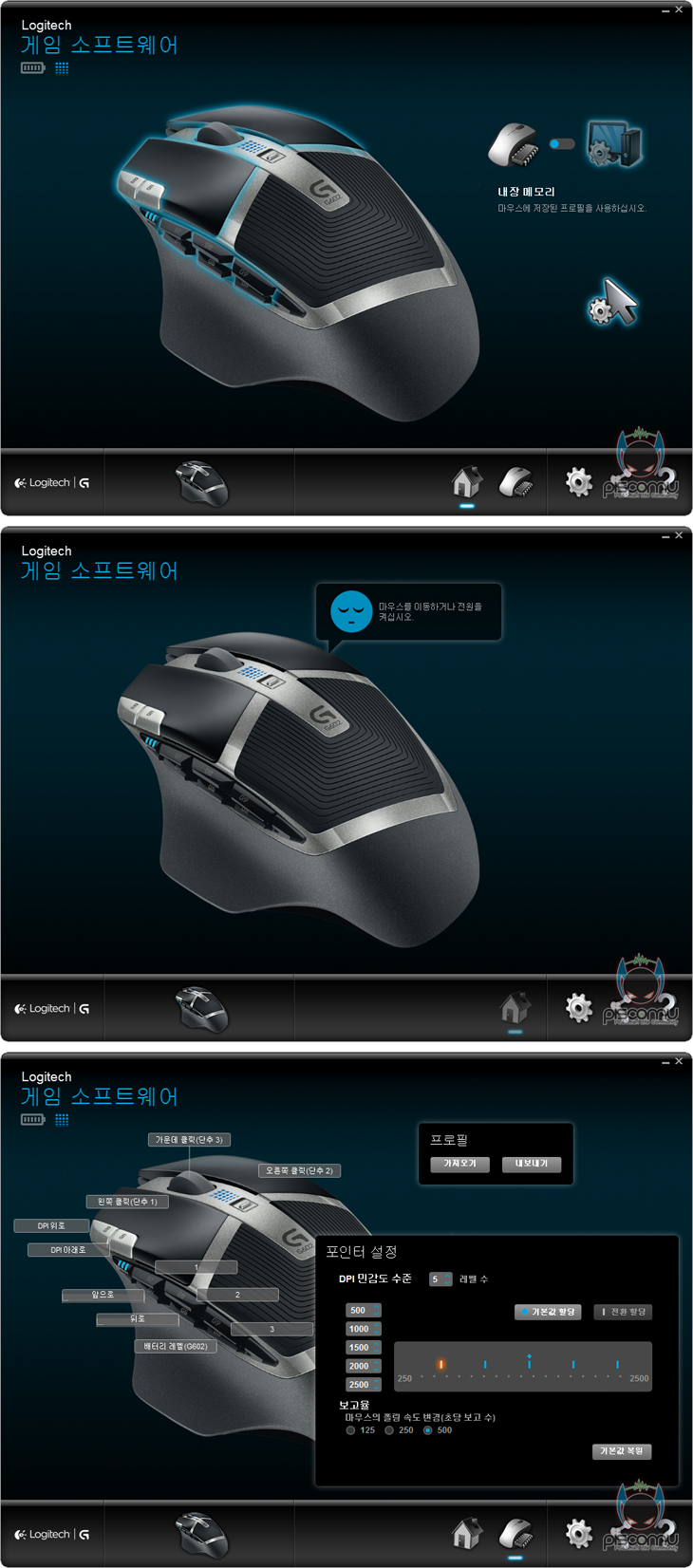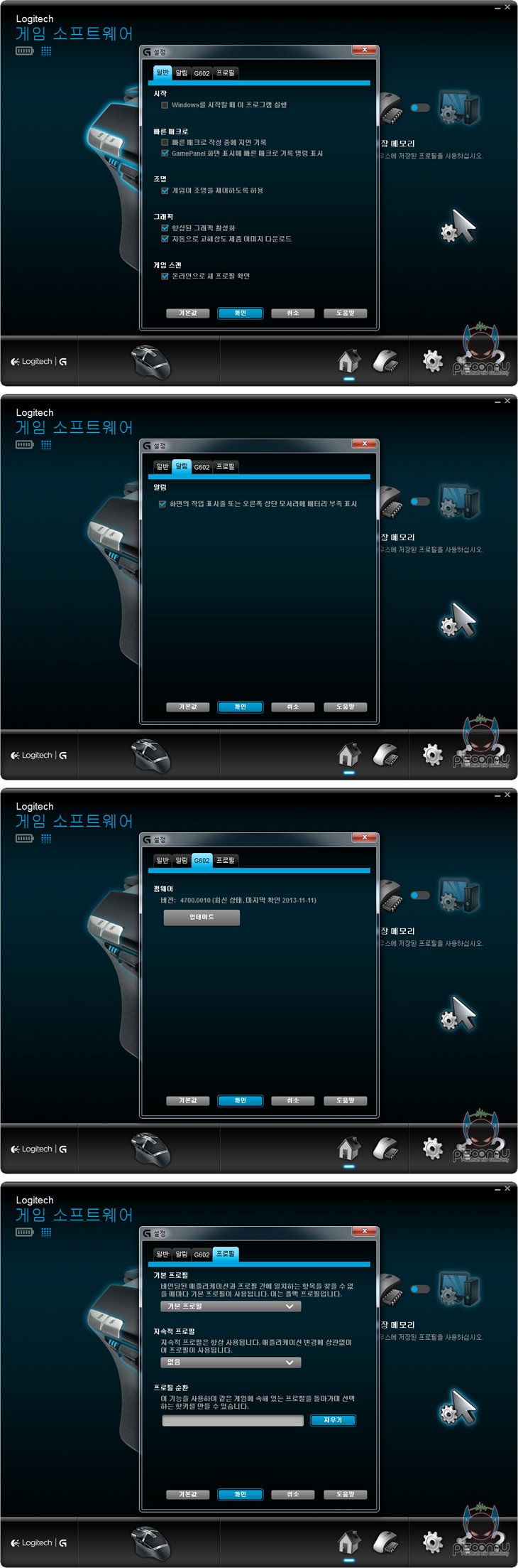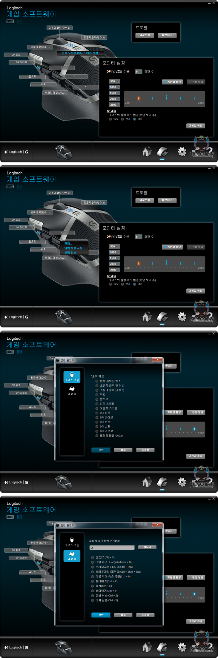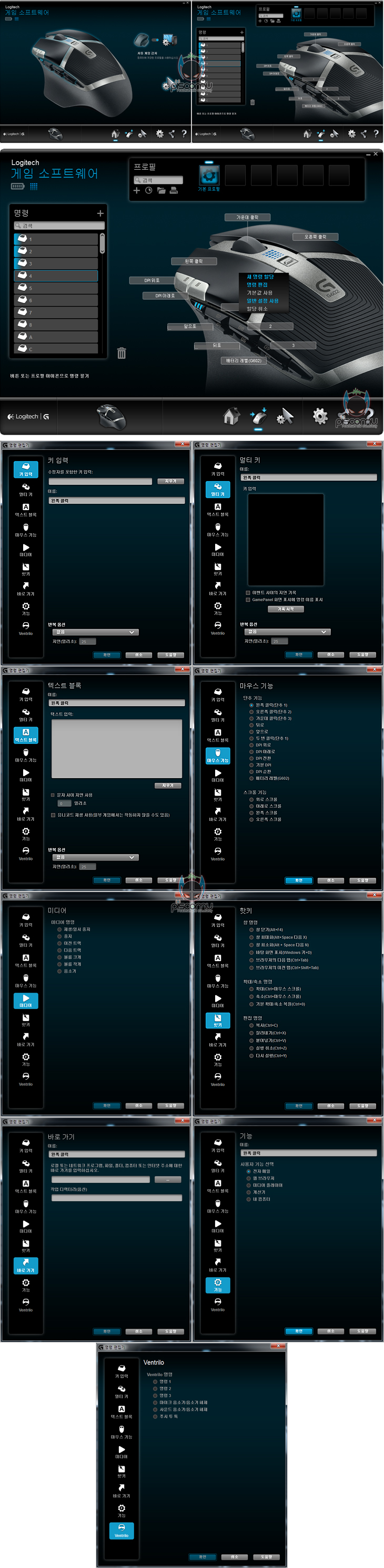 G602 역시 자사의 게이밍 라인업 모델이기 때문에 로지텍에서 제공되는 공용 소프트웨어가 지원됩니다. 프로그램을 설치하고 실행하며, 메인화면에 PC에 연결된 G602의 정보를 불러와 보여주는데, 장시간 사용하지 않을 시에는 알림 메시지를 보여주기도 합니다. 그리고, 내장메모리 프로필 설정을 통해서는 마우스의 버튼 기능과 DPI 단계 조절, DPI값 설정, 수신기의 전송제어 속도를 사용자가 설정할 수 있습니다. 특히, 버튼 기능 변경 경우, 기본 좌우 버튼은 서로 반대 기능으로 바꿀 수 있으며, 나머지 추가로 지원되는 버튼들은 기본 설정 외에 사용자가 입력한 단일 키 값이나 운영체제에서 흔히 사용하는 단축 키로 변경이 가능하며, 마우스 기능으로도 변경이 가능하겠습니다. 그리고, 내장 메모리 외에 다른 한 가지인 자동 게임 감지로 선택했을 시에는 각 버튼에 기능들을 다양하게 더 많이 사용자가 지정할 수 있는데, 명령 편집기를 통해 앞서 내장 메모리와 같이 키 입력, 마우스 기능을 비롯해, 매크로 설정의 멀티 키, 텍스트 블록, 재생 관련의 미디어, 운영체제 및 기본 프로그램의 공용 단축 키 설정 핫 키, 이 외에 바로 가기, 보조 프로그램 실행의 기능, 음성 명령의 Ventrilo 기능까지 총 9가지의 메뉴를 통해서 각 메뉴에 사용자가 기능들을 설정할 수 있겠습니다. 이 외에 공용 설정을 통해서는 윈도우 시작 실행 및 매크로, 조명 등의 일반 설정과 알림 설정, 펌웨어 업데이트, 프로필에 대한 설정을 할 수 있습니다. 전반적으로 다양하게 기능 설정을 지원해주고 있어, 사용자가 사용하는 PC환경에 맞춰 최적의 설정을 맞출 수 있겠습니다.