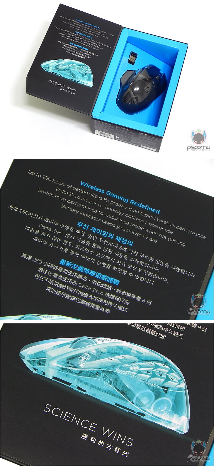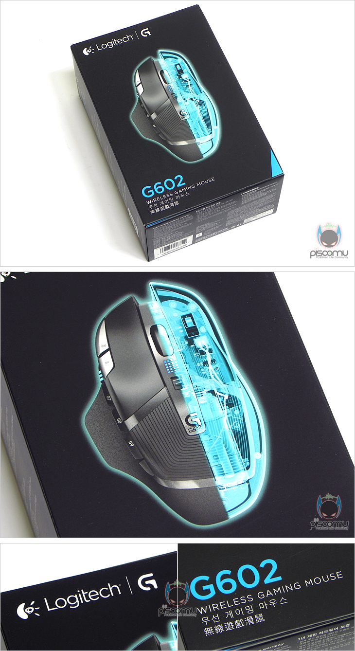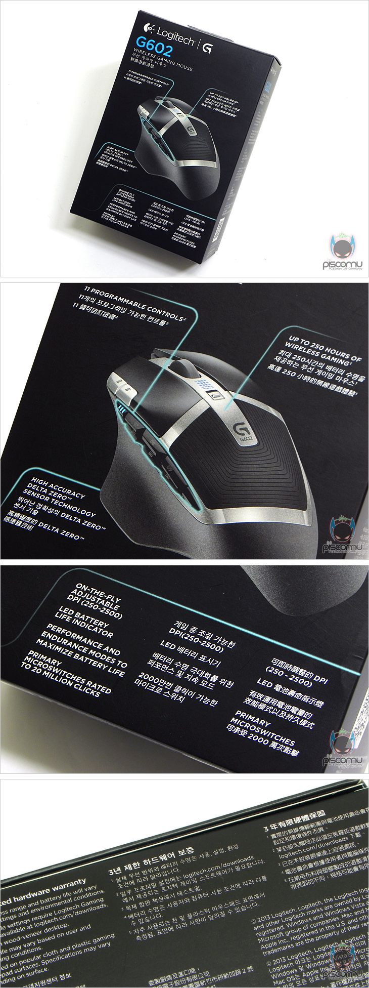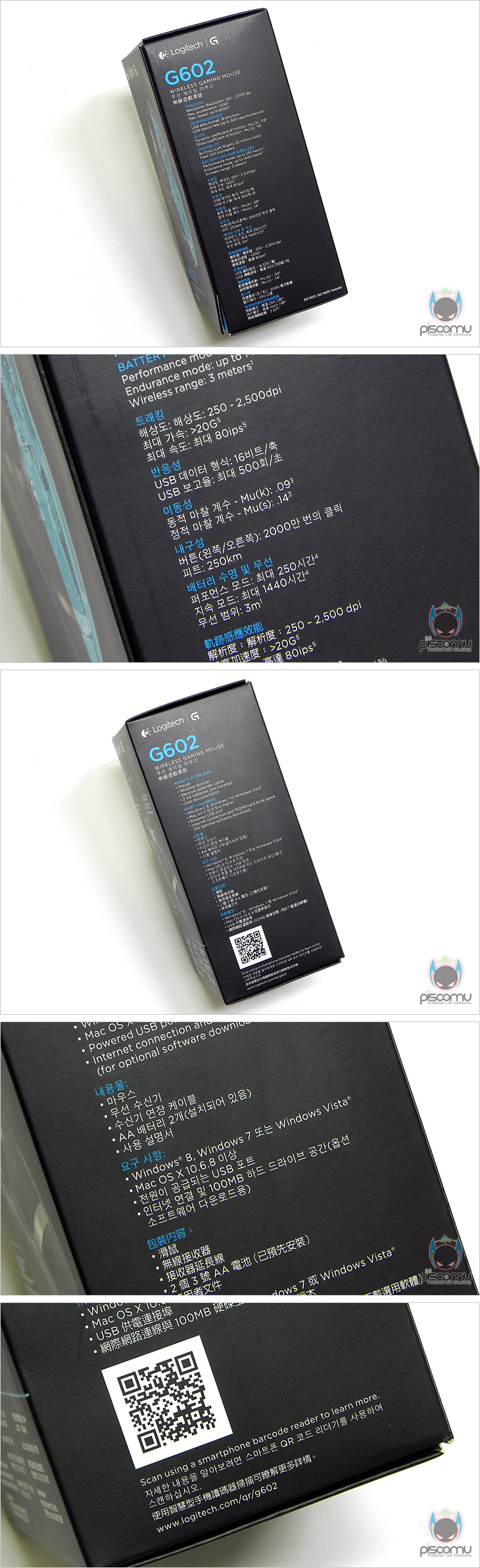 G602 제품 박스 전면에는 해당 모델의 이미지가 삽입되어 있는데, 외/내부 반반씩 보여주는 디자인입니다. 그리고, 해당 모델은 게이밍 라인업이기 때문에, 제조사 로고와 함께 게이밍 로고가 표기되어 있으며, 모델명을 확인할 수 있습니다. 다른 게이밍 마우스들과 마찬가지로 G602 역시 전면 커버가 오픈 되어 내부에 포장된 제품을 간접적으로 확인할 수 있습니다. 그리고, 커버 안쪽에는 제품의 특징을 소개하고 있는데, 배터리 수명과 제조사의 센서 기술, 모드 지원을 언급하고 있습니다. 박스 측면에는 각각 기본 스펙과 구성품 목록, 운영체제 지원을 확인할 수 있는데, 스펙에선 해상도, 가속, 속도, 배터리 수명, 수신 범위 등을 확인할 수 있는데, 250시간의 배터리 수명이 단연 눈에 가장 띄겠습니다. 그리고, QR코드를 삽입해 스마트폰/타블렛PC로 제조사 홈페이지에 등록된 제품에 추가 정보를 얻을 수도 있겠습니다. 박스 후면에는 제품 이미지를 통해 부위별로 추가 특징을 소개하고 있는데, 추가 버튼 지원, 배터리 수명, 센서를 언급하고 있으며, 해상도, 버튼 수명도 언급을 하고 있습니다. 그리고, 제품 보증 기간은 3년이 되겠습니다. 제품 포장은 속박스를 적용한 형태로 제품이 포장된 박스는 따로 분리가 되며, 본 제품인 마우스를 비롯한 제품 구성에는 USB 수신기, USB 연장 케이블, 제품 설명서, 보증서로 이루어져 있습니다. USB수신기 연장 케이블의 길이는 약 1.6m이며, 장소에 따라 사용 여부를 사용자가 결정하면 되겠습니다.