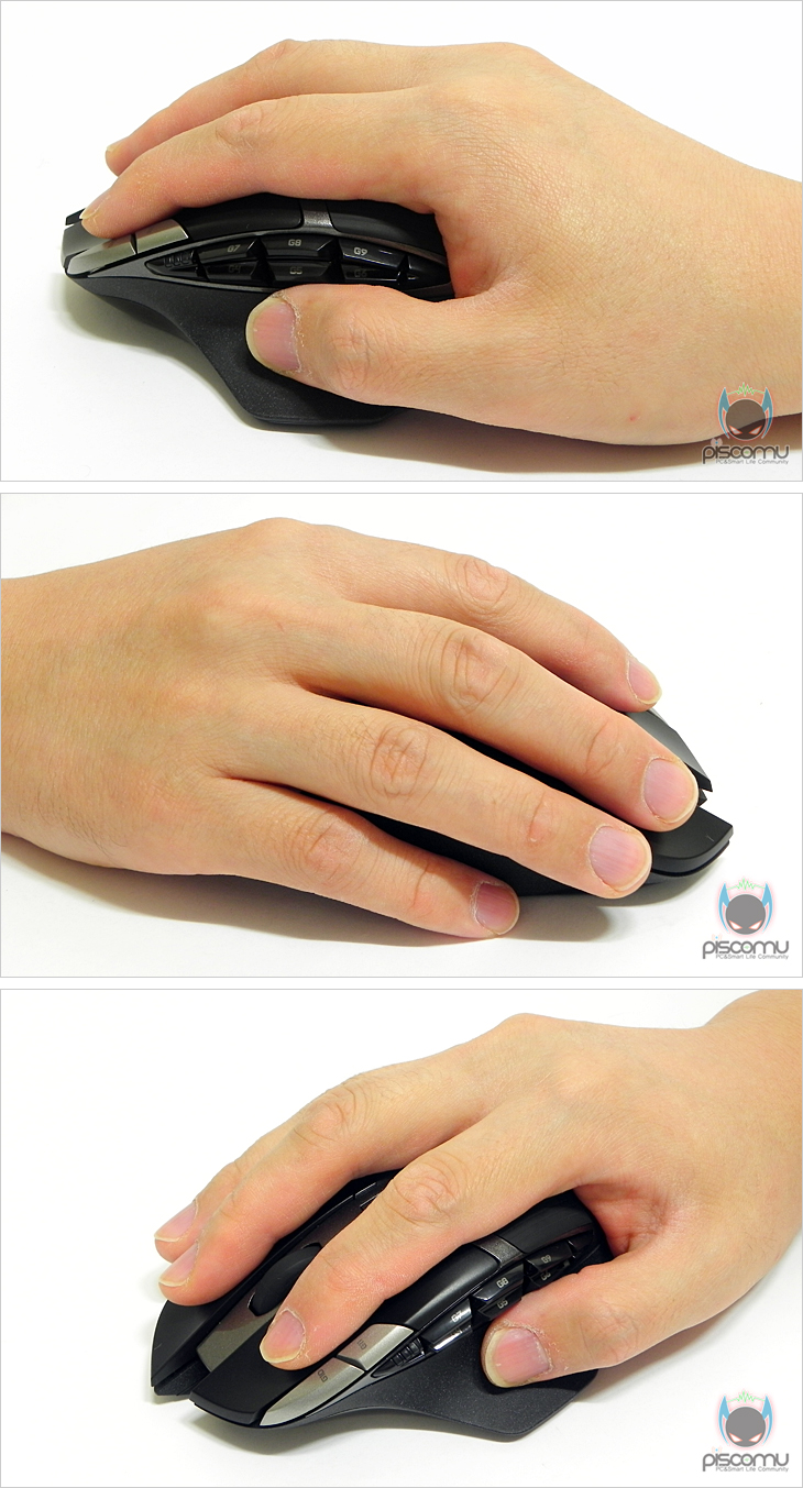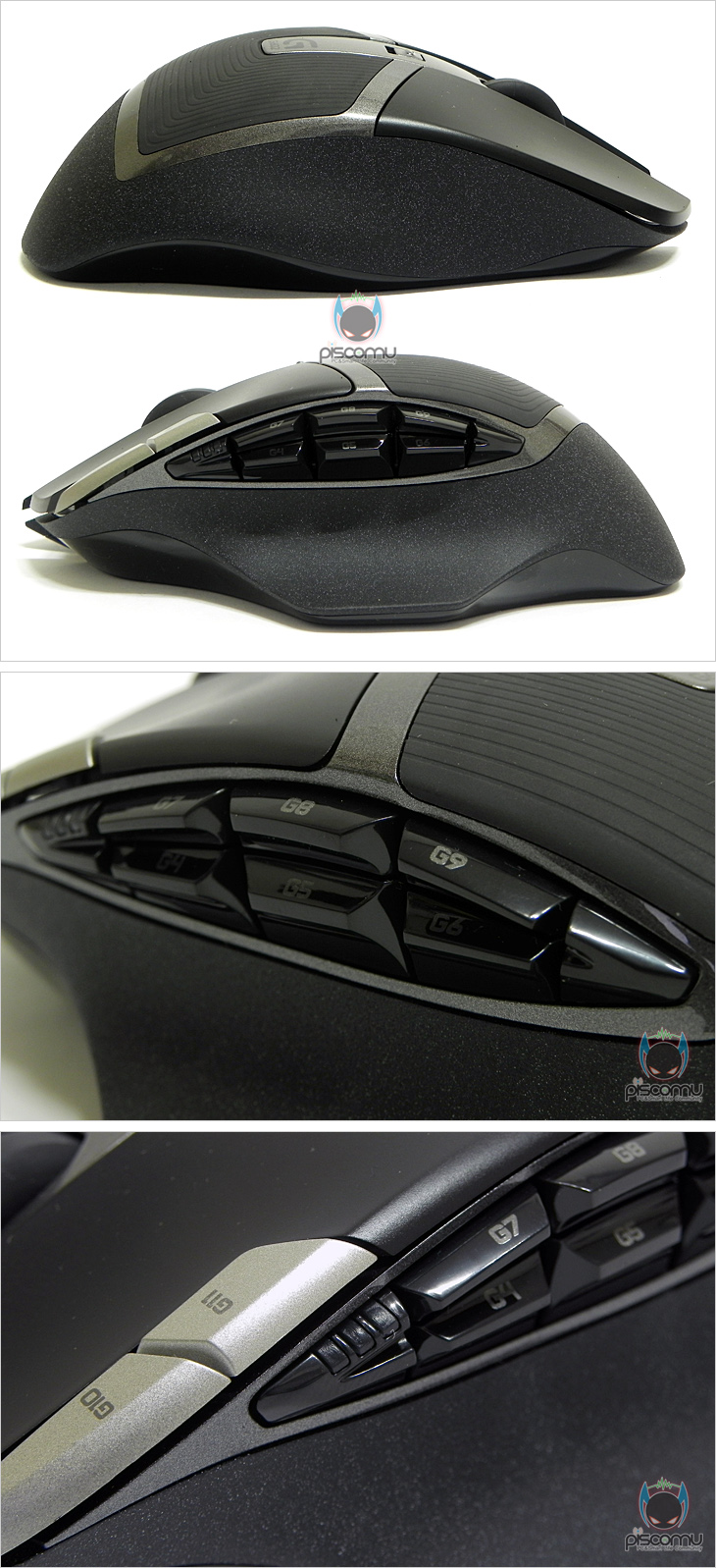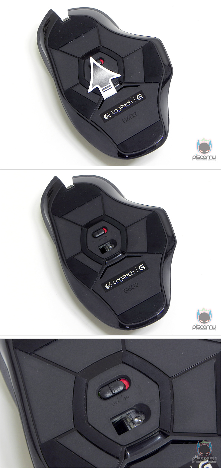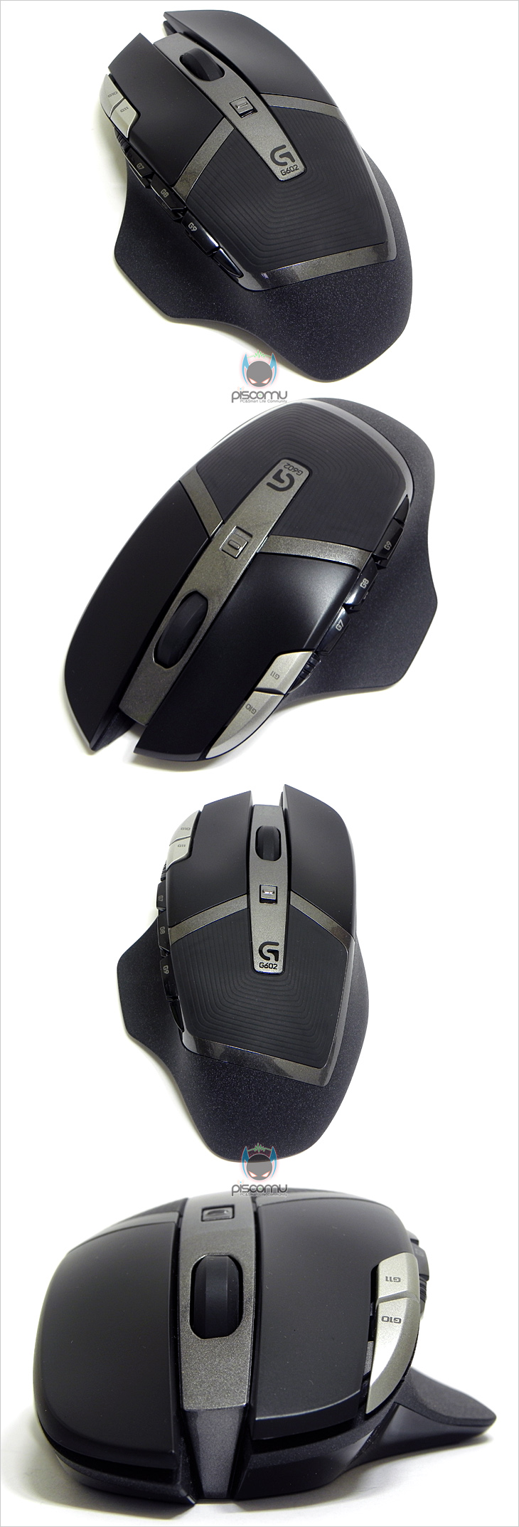 G602를 살펴보면, 전체적인 색상 계열을 블랙이며, 부분마다 포인트로 크롬 색상의 디자인과 일부 광택처리를 적용해 고급스러운 느낌을 살렸습니다. 또한, 마우스 전체 디자인을 봤을 때, 좌우 비대칭으로 오른손 전용 마우스임을 알 수 있으며, 오른손에 최적화된 인체 공학적 디자인을 지녔습니다. 기본 좌우 버튼을 보면, 오른쪽 버튼이 왼쪽 버튼보다 좀 더 긴 것을 확인할 수 있는데, 이 역시 검지보다 중지가 길기 때문에 적용된 디자인이라 할 수 있습니다. 그리고, 가운데 휠-버튼은 고무 재질을 적용했으며, 왼쪽 버튼 맨 왼쪽에는 2개의 버튼이 배치되어 있는데, DPI값을 변경하는 스위치 역할로 G10은 Up, G11은 Down이 되겠습니다. 그리고, 휠-버튼의 뒤에 배치된 스위치는 퍼포먼스와 지속 모드 전환 스위치로 휠-버튼과 스위치 사이에 작동 시 모드 전환을 표기해주는 LED 램프를 확인할 수 있겠습니다. 손바닥 부분의 팜-레스트 부분은 고무 재질을 적용해 착용감을 높였습니다. 마우스 측면을 보면, 좌측에는 추가 버튼들이 배치되어 있는데, 총 6개의 버튼으로 G4/5는 기본 기능으로 앞/뒤 기능, G6는 배터리 수명 확인, G7/8/9는 기본 설정으로 숫자키 1,2,3으로 지정되어 있겠습니다. 또한, 맨 앞부분에는 앞서 확인한 DPI전환 버튼에 따른 DPI값 단계를 보여주는 LED 램프를 확인할 수 있습니다. 마우스 밑면에는 초기 상태 시 배터리 소모 방지 탭이 붙여 있으며, 제거를 하면, 가운데 센서 바로 위에 수신 On/Off 스위치가 배치된 것을 확인할 수 있습니다. 그리고, 앞뒤좌우 위치로 테프론 피트가 기본 부착된 것도 확인할 수 있겠습니다. 센서는 제조사의 델타제로 센서라 불려지는 센서로 센서 바탕은 광(Optical)센서가 되겠습니다. 그리고, 센서 아래에는 내부 배터리를 넣은 공간으로 커버를 쉽게 분리할 수 있으며, 내부에 AA규격의 건전지 2개가 기본 제공되어 장착된 것을 확인할 수 있습니다. 그리고, 이동 시 USB 수신기를 수납할 수 있는 공간을 오른쪽에 적용한 점도 확인할 수 있습니다. 배터리 수명은 앞서 표기된 것처럼 퍼포먼스 모드에선 최대 250시간, 지속 모드에선 최대 1440시간을 가지고 있습니다. 끝으로, 배터리가 장착된 상태에서 마우스 무게는 약 152g이 되겠습니다.