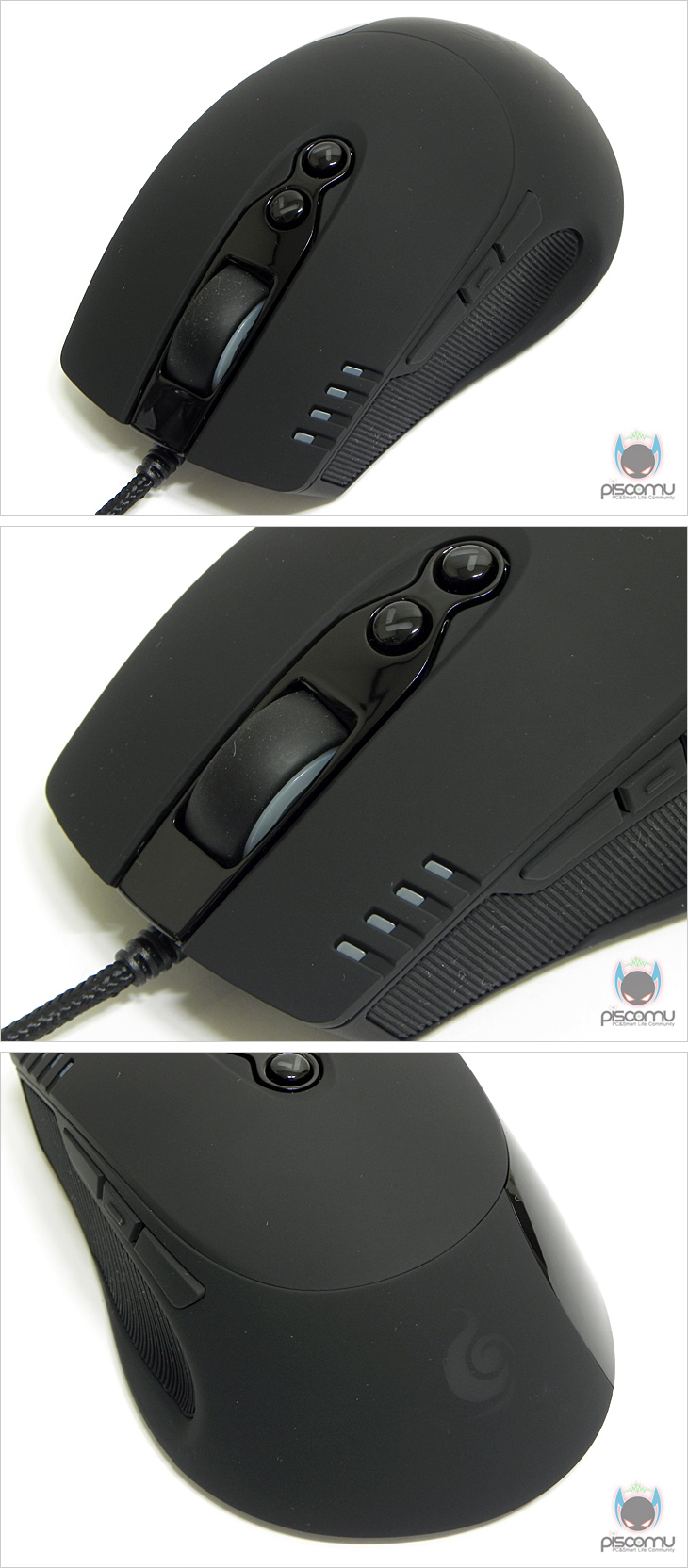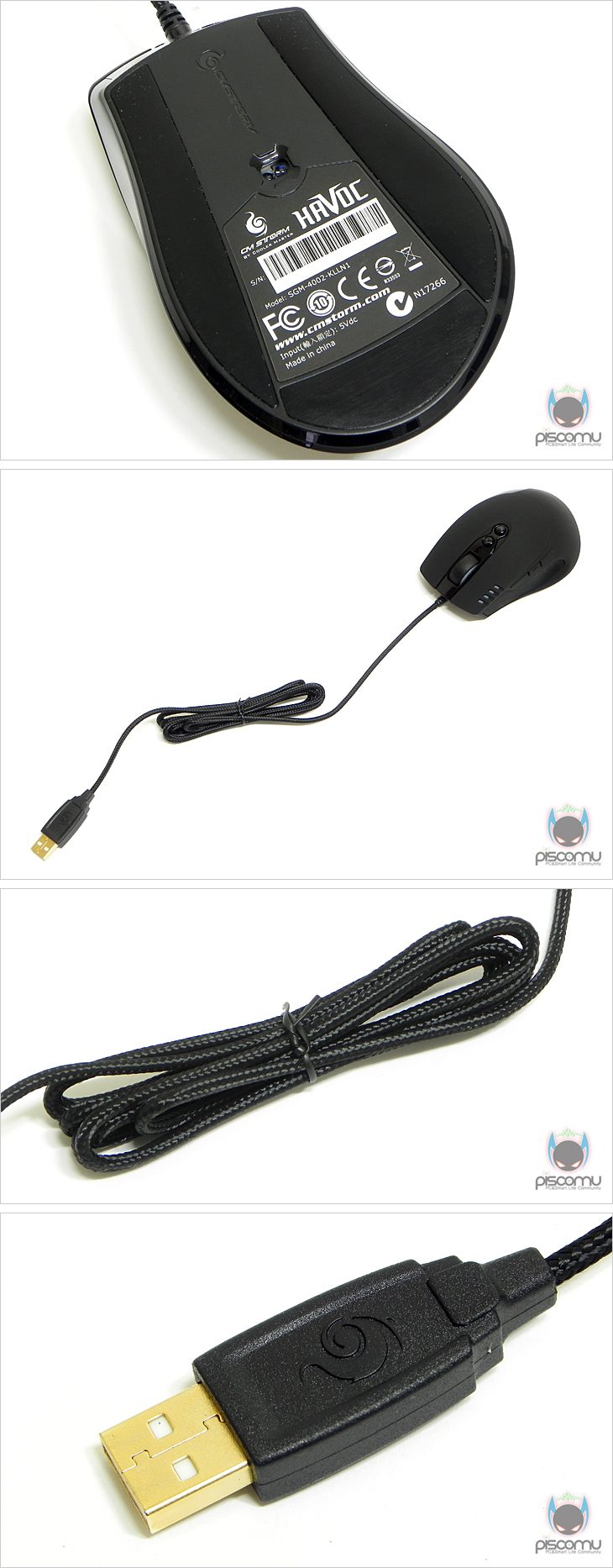 HAVOC을 살펴보면, 색상은 전반적으로 블랙계열이며, 버튼과 손바닥 그립 부분의 마우스 상위 부분은 러버 코팅으로 처리가 되어 있으며, 좌우 비대칭 형태로 오른손 전용을 위한 인체공학적 디자인을 갖추고 있음을 확인할 수 있습니다. 기본 좌우 버튼은 앞서 제품 박스에서 소개했듯이, 일본 옴론(OMRON)사 스위치가 적용되어 최대 5백만 번의 클릭 수명을 가지고 있으며, 왼쪽 버튼 가장자리에는 DPI값을 표시해주는 LED 램프가 처리되어 있습니다. DPI 변경 버튼은 휠-버튼 뒤에 배치되어 총 4단계로 변경할 수 있습니다. 휠-버튼은 손가락이 닿는 부분은 고무 재질을 사용했으며, 측면은 역시 LED효과를 볼 수 있도록 처리했습니다. 그리고, 손바닥 부분의 팜-레스트 부분에는 CM STORM 로고가 새겨져 역시 LED 효과를 볼 수 있게 지원하고 있습니다. 마우스 측면을 살펴보면, 우측은 광택 처리가 되어 있는데 광택 처리가 그대로 이어지는 부분은 전면과 휠-버튼 주변까지 되겠습니다. 좌측은 고무 재질 적용과 일정 간격의 패턴 문양이 처리되어 엄지 손가락에 의한 미끄럼 방지를 통한 그립감을 높이도록 했습니다. 그리고, 좌측에는 추가 버튼이 3개 배치되어 있는데, 앞에 2개는 기본 기능으로 웹-페이지 앞/뒤 기능이며, 나머지 1개는 프로파일 변경 기능을 기본으로 설정되어 있겠습니다. 마우스 밑면에는 좌우뒤자리에 큼지막한 테프론 피트를 기본 부착에 움직임에 유연성을 가지도록 했으며, 가운데 레이저 센서부분은 제품 박스에서 소개했듯이, PixArt의 ADNS-9800 센서가 적용되어 최대 해상도 8200DPI까지 지원해줍니다. 끝으로, 케이블 길이는 최대 1.8m로 유선으로 충분한 길이를 가졌으며, 깔끔하게 전체 패브릭 슬리빙 처리를 했으며, 연결 인터페이스 방식은 USB로 신호손실을 적게하도록 금도금 처리를 적용했습니다. 전송제어 속도는 1000Hz 최대치까지 지원합니다.