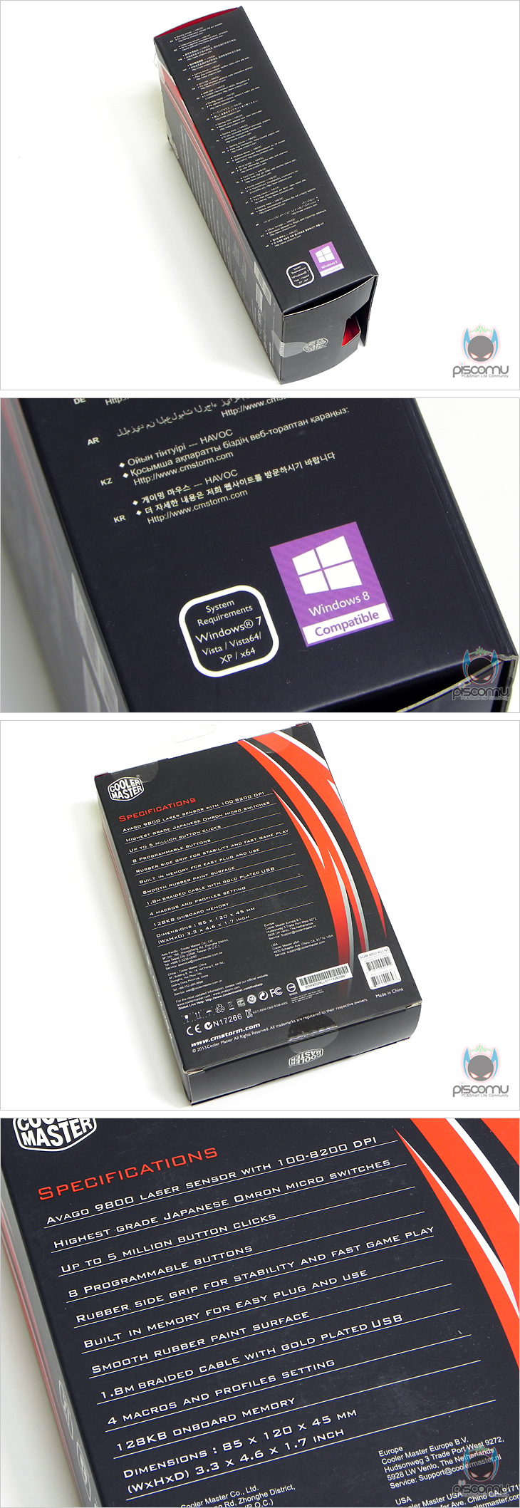 제품 박스는 기존의 자사 CM STORM 라인업 마우스들과 유사합니다. 해당 제품의 이미지 삽입과 모델명을 전면에서 확인할 수 있는데, 모델명에 해상도 범위도 표기가 되어 있어 이번 제품의 주요 특징임을 짐작할 수 있습니다. 이번 제품 역시 기존 자사 제품들처럼 전면 커버가 열리는 오픈 방식에 내부 포장된 해당 제품 마우스를 간접적으로 확인할 수 있습니다. 그리고, 커버쪽 내부에는 마우스 이미지와 함께 부위별로 제품 특징을 언급하는데, 컬러 LED, DPI, 내장 메모리, 버튼 스위치, 버튼 지원 수, 측면 그립 코팅 처리에 대해 언급하고 있습니다. 박스 측면에는 해당 제품의 추가 정보를 위해 자사 웹-사이트 주소를 알려주고 있으며, 운영체제 지원도 확인할 수 있습니다. 그리고, 박스 후면에는 제품 특징을 소개하는데, 센서와 스위치 제조사 언급까지 상세히 설명을 하고 있으며, 케이블 길이, 마우스 크기 표기도 눈에 들어오겠습니다. 제품 구성은 마우스를 비롯해, 설명서, 보증서로 간단히 이루어져 있으며, 설명서에는 한글 표기의 제품 특징과 제품의 기본 스펙 정보를 확인할 수 있습니다.