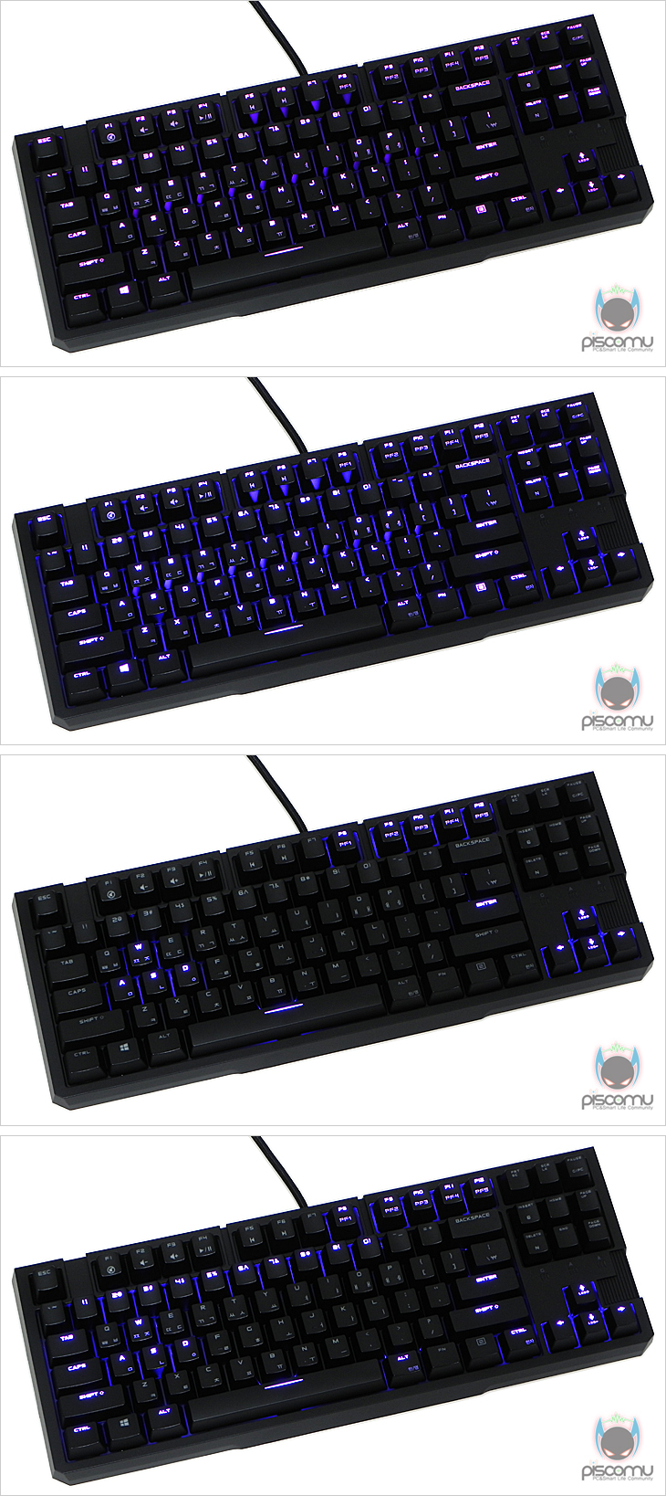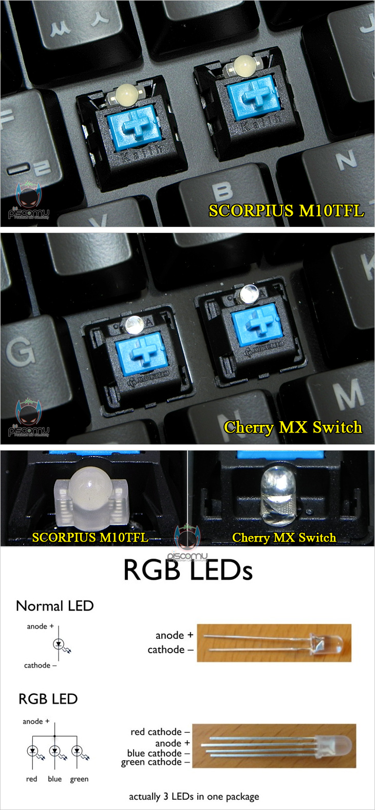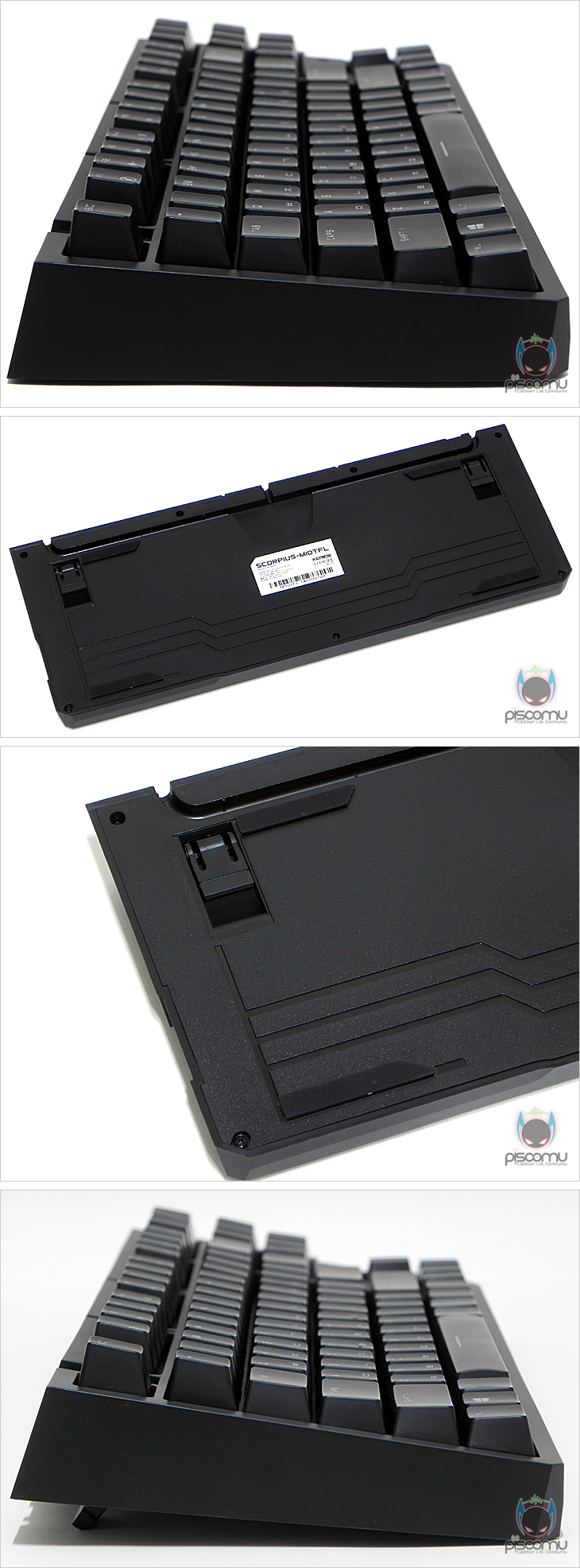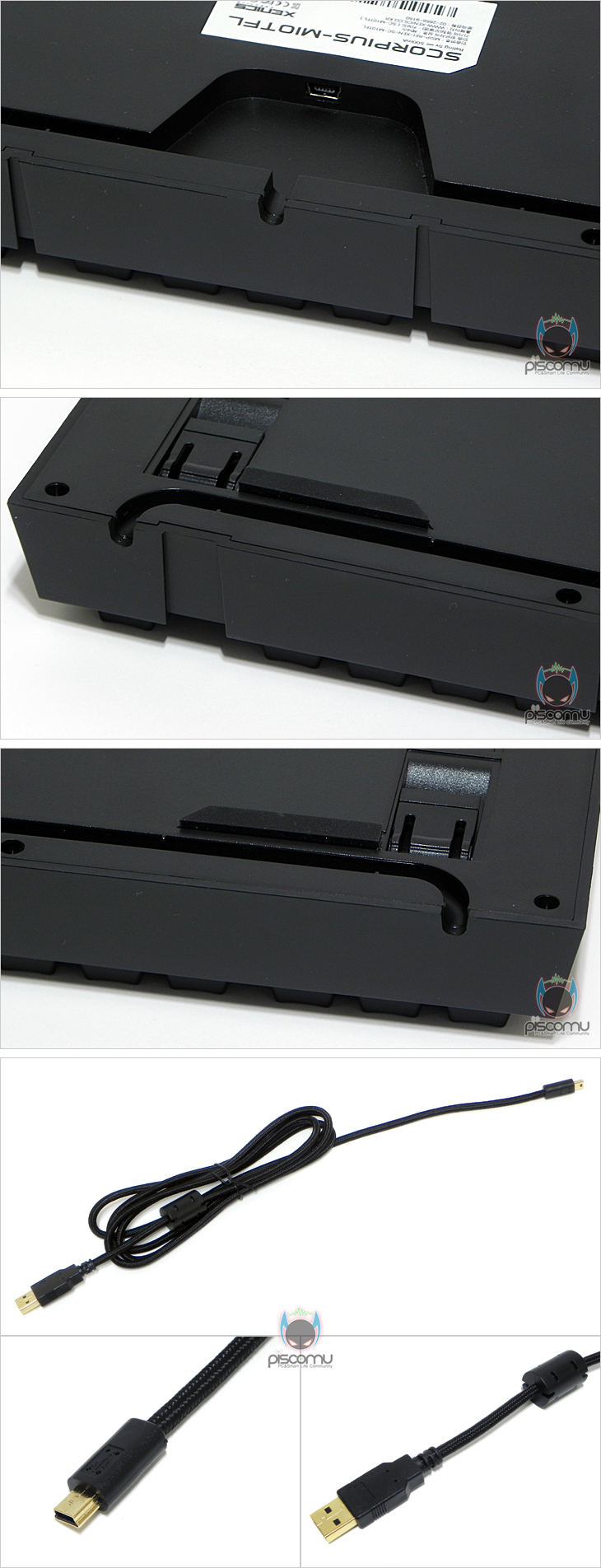 SCORPIUS M10TFL의 디자인을 살펴보겠습니다. 색상은 기본 블랙이며, 키-배열은 숫자-키패드가 빠진 총 87키의 텐-키리스가 되겠습니다. 전체 사이즈는 360(L)x140(W)x40(H)mm로 컴팩트 사이즈이며, 키보드 테두리 베젤 두께가 얇은 것이 특징입니다. 두께는 15~17mm입니다. 좀 더 부위별로 살펴보면, 일단, 키-캡의 폰트 처리는 고딕체 형태이며, 텐-키리스 배열이기 때문에 윈도우 키는 왼쪽에 1개만 적용, 오른쪽 윈도우 키 자리에는 윈도우 키 대신 FN(펑션) 키가 적용되어 있습니다. 그리고, 오른쪽 Alt 키는 한/영 키 역할을 합니다. Fn(펑션) 키를 통해서는 부가 기능을 지원하고 있는데, 먼저 F1~F6키까지는 멀티미디어 기능 키로, F1부터 음소거, 볼륨감소, 볼륨 증가, 재생/일시정지, 이전, 다음 재생을 지원하고 있습니다. 그리고, F8키부터 F12키까지는 프로파일 키로 총 5개의 프로파일을 지원합니다. 이 외에 특수 키인 Pause/Break 키를 통해서는 게이밍 모드와 PC모드를 전환하는 G모드 지원을 해주는데, G모드 전환 시 자동으로 윈도우 키는 잠금 상태가 됩니다. 또한, 바로 아래 LED 램프를 통해서도 G모드 활성화 여부를 확인할 수 있습니다. 그리고, Insert와 Delete 키를 통해서는 각각 6키와 무한 동시 키 지원으로 전환을 각각 해줍니다. 또한, 방향 키 중 상하 키를 통해서는 각각 LED 조절을 할 수 있는데, 밝기 조절부터 LED Off, LED 최대 밝기, LED 중간 밝기, 펄스(숨쉬기) 모드와 게이밍 환경에 적합한 게임존(Gamezone) 모드 2가지를 지원해주고 있습니다. 그리고, 이번 SCORPIUS M10TFL의 특징 중 하나가 바로 스위치인데, 그 동안 제닉스 뿐만 아니라 경쟁사의 기계식 키보드 모두 스위치는 대부분 독일의 체리사 MX 스위치를 보편적으로 많이 사용했습니다. 하지만, 이번 SCORPIUS M10TFL은 KAIHUA ELECTRONICS社의 Kailh 스위치를 사용했습니다. 그 이유는 이번 SCORPIUS M10TFL이 풀-컬러 LED 지원을 하는 모델로 여기서 풀-컬러라는 것은 LED를 다양한 색상으로 사용자가 변경할 수 있다라는 것을 의미하는데, LED가 1가지 이상 색상을 지원하기 위해서는 RGB LED를 사용해야 합니다. 실제, SCORPIUS M10TFL에 적용된 Kailh 스위치의 LED가 기존 단색을 지원하는 체리 MX 스위치의 LED와 모양이 다른 것을 확인할 수 있습니다. 물론, RGB LED가 적용된 스위치는 작년 하반기 체리사에서도 개발을 했습니다. 하지만, 미국 하드웨어 브랜드 커세어社가 체리사의 RGB LED 스위치에 대한 독점 계약이 체결되면서, 커세어를 제외한 나머지 경쟁사 키보드 업체들은 RGB LED가 적용된 체리사의 새 스위치를 현재로썬 사용할 수 없습니다. 그래서, 이번 SCORPIUS M10TFL에 스위치가 Kailh 스위치로 적용된 것입니다. 아직까지 체리사 RGB LED의 스위치가 적용된 커세어사의 기계식 키보드가 출시되지 않았지만, 맥락은 Kailh와 차이가 없습니다. 따라서, 일부 소비자 경우 키-압력에 민감한 소비자라면 체리사 MX 스위치 청축이 50g, Kailh 스위치 청축이 60g으로 키-압력에 대한 차이를 느낄 수도 있겠습니다. 키보드 측면을 통해서는 타이핑이 가장 편안한 키 구조 단계인 스텝스 컬쳐2 단계로 구조 배열이 된 것을 확인할 수 있습니다. 그리고, 키보드 밑바닥부분에는 미끄럼 방지를 위해 모서리 부근 앞뒤 자리에 고무 패드를 기본 부착했으며, 앞 자리에는 높낮이 받침대가 적용되어 사용했을 시, 기본 높이에서 약 3° 가량 앞부분을 높일 수 있습니다. 그리고, 앞자리 가운데는 USB 전원케이블을 꽂는 포트 배치로 케이블 연결 후 케이블 고정 정리를 할 수 있게 라인 홈을 처리했는데, 가운데, 왼쪽, 오른쪽에 각각 처리되어 사용자 편의에 따라 고정할 수 있습니다. USB 전원케이블은 모두 깔끔하게 슬리빙 처리가 되었으며, 케이블 길이는 1.8m이며, 양쪽 모두 포트 부분은 신호 손실 최소화를 위해 금도금 처리를 했으며, 일반 USB 포트쪽에는 케이블 부분에 노이즈 필터도 함께 처리되어 있습니다.