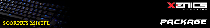 SCORPIUS M10TFL의 제품 박스는 작은 편으로, 풀-배열의 키보드가 아님을 짐작할 수 있습니다. 뒤에서 확인하겠지만, 이번 모델은 텐-키리스(Ten-keyless) 모델이 되겠습니다. 박스에는 모델명과 운영체제 호환성을 가장 먼저 확인할 수 있습니다. 그리고, 판매 제품에 신뢰도로 개봉 부분에 동봉 스티커를 적용하고 있는데, 개봉 후 불량이 아닌 이상 반품/환불이 불가능하겠습니다. 참고로 제품 보증 기간은 기존 모델들과 마찬가지로 구입일로 1년 입니다. 그리고, 이번 모델의 스위치는 청축, 갈축, 적축으로 출시되었으며, 해당 제품의 스위치는 박스에 표시를 하고 있어, 구입 전 확인이 가능합니다. 박스 후면에는 제품 이미지와 제품 특징에 대해 설명을 하고 있는데, 앞서 말했듯이 이미지를 통해 텐-키리스 제품임을 확인할 수 있으며, LED 백라이트 지원도 확인할 수 있습니다. 제품 특징에는 풀-컬러 LED 지원, 긴 수명의 업그레이드 스위치, 안티 고스트, 멀티미디어 기능키, G모드, 6키/무한 동시 키 지원, 전용 프로그램 지원, 512KB 용량의 온보드 메모리 지원을 언급하고 있습니다. 제품 포장은 다른 기계식 키보드들과 마찬가지로 보호비닐을 통해 깔끔하게 포장되어 있습니다. 키보드를 비롯한 제품 구성에는 USB 전원케이블, 키-캡 리무버, 오렌지색의 추가 키캡 4개, 프로그램 CD, 설명서로 이루어져 있으며, 설명서에는 제품 기능 및 모드 사용법이 실려 있습니다.