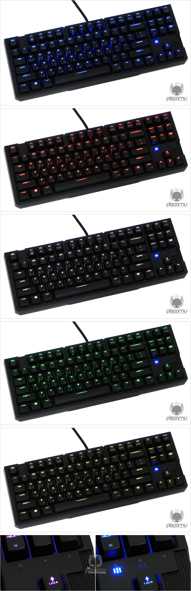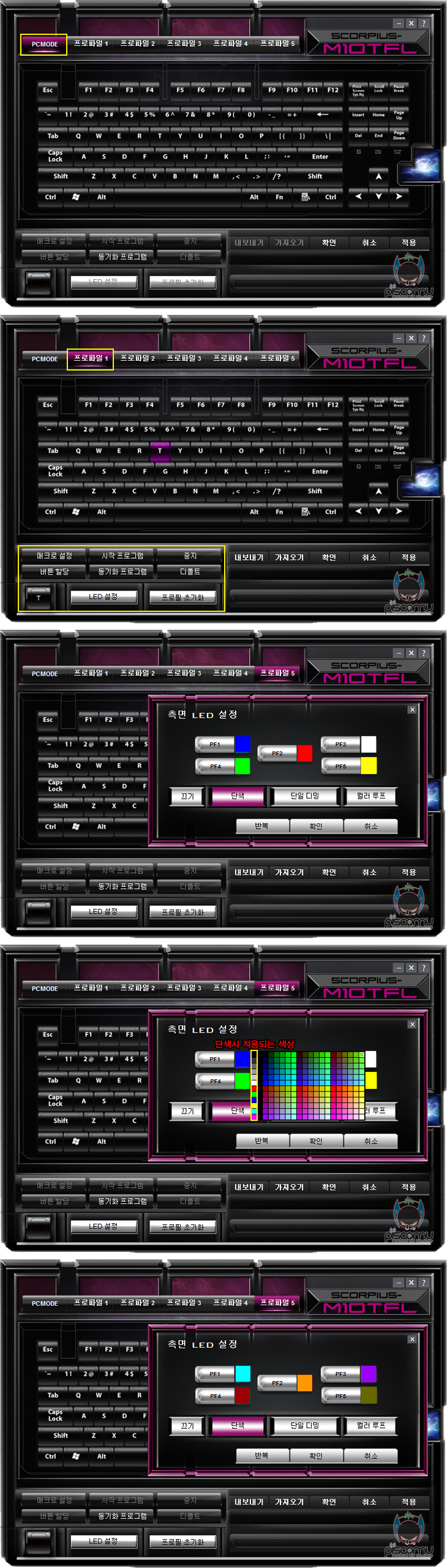 직접, SCORPIUS M10TFL를 사용해 보겠습니다. 먼저, LED 지원에 관해 확인해 보면, 앞서 언급했듯이, 상하 방향키를 통해 조절할 수 있는데, 단계에 따라 중간 밝기, 최대 밝기, 숨쉬기 모드, 게임존 1, 2순으로 전환됩니다. 참고로 기본 PC모드에서 LED 색상은 핑크이며, 색 변경은 되지 않습니다. 또한, 게임존 1, 2 모드 역시 고정 설정으로 각기 다른 키에 LED설정으로 변경은 안됩니다. 그리고, LED색상을 사용자 원하는 색으로 지정해 적용하는 프로파일에는 F8키부터 F12키까지 LED색상이 기본적으로 각기 다른 색상으로 적용되어 있는데, 블루, 레드, 화이트, 그린, 옐로우 순으로 기본 설정 되어 있습니다. 다른 색상을 원할 경우 전용 프로그램에서 프로파일 선택 후 색상을 변경하면 됩니다. 그리고, 프로파일 적용 시 모드는 모두 게이밍 모드가 되겠습니다. 게이밍 모드는 G 램프 On/Off로 바로 확인할 수 있습니다. 앞서 특징해서 확인했듯이, SCORPIUS M10TFL는 전용 프로그램을 제공합니다. 프로그램을 설치해 실행하면, 메인 화면은 PC모드로 PC모드에서 별다른 설정을 할 수 없습니다. 기본 상태 설정 그래도 사용해야 합니다. 사용자 정의 설정은 프로파일부터 가능한데, 매크로 설정부터 시작프로그램, 버튼 할당, 동기화 프로그램 등을 설정할 수 있습니다. 그리고, LED설정이 활성화 되면서, 프로파일에 지정된 LED 색상을 사용자가 원하는 색상으로 변경할 수 있습니다. 또한, 작동에는 설정을 할 수 있는데, 끄기, 단색, 단일 디밍, 컬러루프 4가지 설정을 지원하고 있습니다. 단, 한가지 알아야 할 점은 단색 지정시에는 색상표 중 왼쪽 분리된 색상표에서만 선택을 해야 색상 적용이 되며, 오른쪽 여러 가지 색상의 색상표에 색상을 적용하고 싶을 때는 단일 디밍(숨쉬기)이나 컬러 루프(지정색 순차숨쉬기)로 설정해야 색상이 적용됩니다. 아쉬운 점이라면, 여러 색상표가 지원되지만, 일부 색상은 정확히 설정한 색상으로 표현되지 않고, 기본 바탕색에 가까운 색으로 적용되는 경우가 있어 완성도에 조금 아쉽다 할 수 있습니다. 그리고, 스위치 경우 앞서 말했듯이, SCORPIUS M10TFL에는 Kailh 스위치로 체리사의 MX 스위치와는 청축 경우 압력 차이가 조금 있습니다. 하지만, 실제 타이핑을 해봤을 시, 압력에 민감한 사용자가 아니라면, 큰 차이를 느끼기 어려우며, 청축 특유의 타이핑 소음은 Kailh 스위치가 약간 높은 편입니다. 참고로, 이번에 적용된 Kailh 스위치는 기존의 Kailh 스위치를 사용한 것이 아닌 RGB 스위치를 위해 기존 스위치보다 수명(5만회)과 성능을 개선한 모델이기 때문에, 아직 출시되지 않은 체리사의 RGB 스위치가 나왔을 때, 확실한 Kailh RGB 스위치 평가를 소비자들이 할 수 있다 생각됩니다. 현재로썬, 기존 체리 청축과 큰 차이가 없기 때문에 사용에는 큰 불편이 없겠습니다. 끝으로, 게임과 사이트 접속에 SCORPIUS M10TFL를 사용해 본 결과, 무한 동시 키 입력 지원으로 3개 키 이상 필요의 게임에서도 실행이 잘 되는 것을 확인할 수 있으며, 무한 키 및 6키 전환이 가능해 금융 사이트 같은 보안 사이트에서도 문제없이 로그인 접속이 가능하겠습니다.