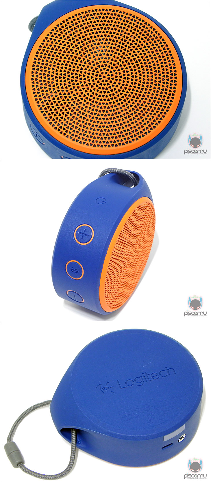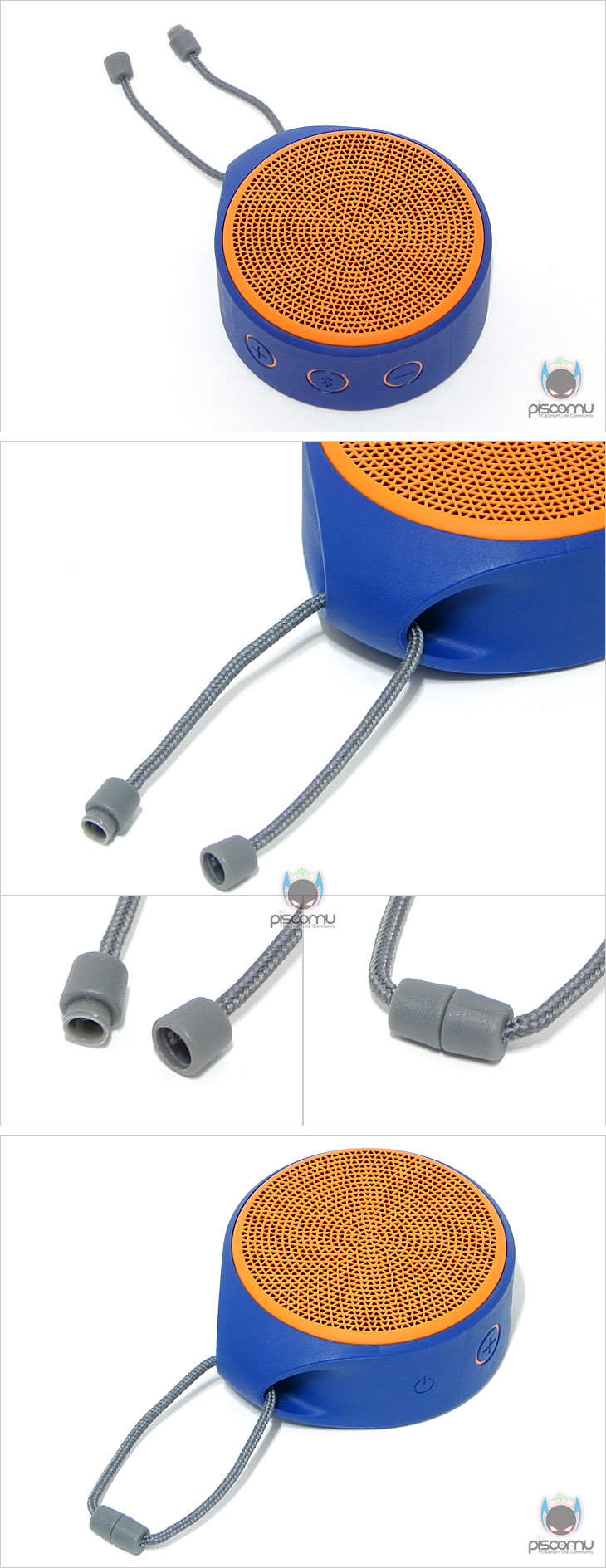 X100을 살펴보겠습니다. 일단, 휴대성이 강조된 컴팩트 포터블스피커라는 컨셉으로 휴대성을 위해 고리끈을 제공하는데, 케이블 양쪽 캡을 서로 연결해서 사용하면 됩니다. 참가로, 무게가 163g 밖에 되지 않아, 고리를 배낭 같은 곳에 걸어 다녀도 무게 부담이 없겠습니다. 사운드가 출력되는 전면은 패턴 디자인 커버를 적용했으며, 원형 크기는 85mm가 되겠습니다. 내부에는 드라이버 유닛이 장착되어 있으며, 전면 커버를 제외한 나머지 테두리 베젤들은 통 하나로 고무 재질을 사용했습니다. 그리고, 이번 베젤 커버에 후면에는 제조사 로고가 새겨져 있습니다. 측면에는 각각 버튼과 포트가 배치되어 있는데, 일단 왼쪽에는 위에서부터 전원버튼, 볼륨 업(UP), 블루투스 연결 페어링, 볼륨 다운(Down) 순으로 배치되어 있으며, 반대편 측면에는 3.5mm 규격의 오디오 잭과 제공되는 USB 충전케이블과 연결되는 마이크로 5핀 포트가 배치되어 있습니다. USB 충전케이블은 스마트폰/태블릿PC에 사용되는 동일한 케이블 형태로 호환이 가능하며, X100 역시 모바일용 충전케이블로도 충전할 수 있습니다. 참고로 배터리는 최대 5시간 사용 가능합니다.