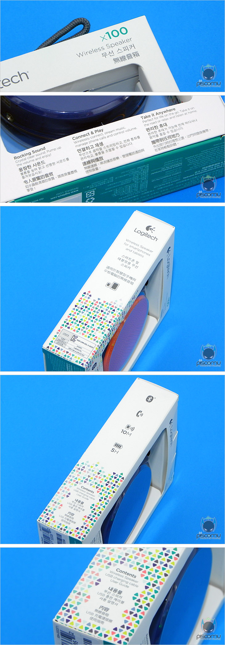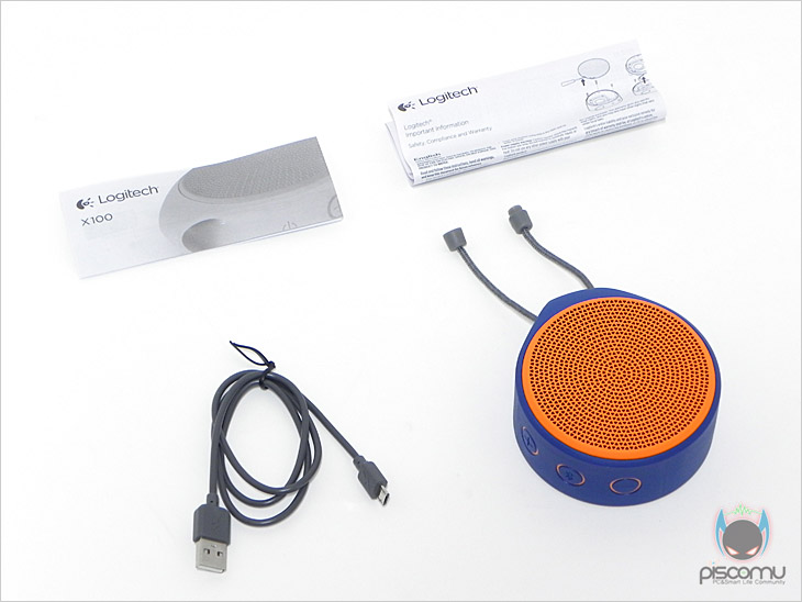 컴팩트한 사이즈를 가진 이번 로지텍 X100은 제품 박스에서 그 크기를 바로 확인할 수 있습니다. 캡(CAP) 형태로 포장되어 외부 노출이 되어 있기 때문입니다. 그리고, 포터블스피커가 액세서리 제품군에 속하는기 때문에 판매 전시를 위해 포장에 고리끈을 적용해놨습니다. 참고로 구입 전, 색상 구분을 확인할 수 있는데, 이번 X100은 총 4가지 컬러 오렌지, 그린, 그레이, 옐로우로 출시되었습니다. 모델명을 비롯해 제품 박스에는 일단 후면에 제품 특징을 영어, 한국어, 중국어 3가지로 소개하고 있으며, 박스 측면에도 컨셉 문구를 동일하게 적용하고 있습니다. 그리고, 반대편 측면에는 지원 기술을 아이콘 형식으로 표기해놨는데, 블루투스, 통화, 무선 거리, 배터리 사용 시간을 뜻합니다. 그 외 제품 구성 목록도 확인할 수 있습니다. 제품 구성은 목록에 적힌 것처럼, 설명서와 보증서를 비롯해 X100 무선 스피커, 충전을 위한 USB 충전 케이블로 이루어져 있습니다. 필요한 기본 구성만 갖추고 있습니다.