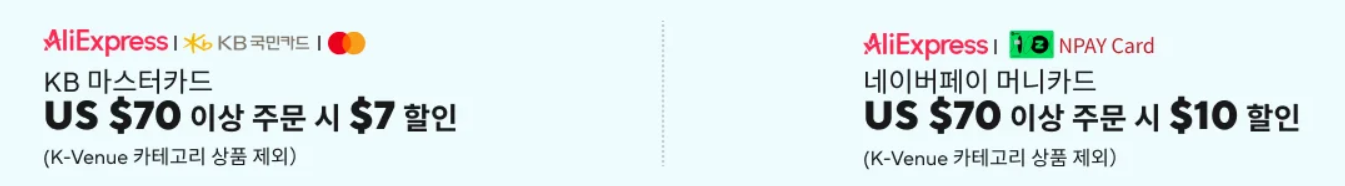 방금 언급했뜻이 7월 프로모션에서 결제할인 행사는 카드사 2개로 KB(국민은행) 마스터카드와 네이버페이 머니카드다. 둘 다 70달러이상 구매시 각각 7달러와 10달러 할인을 해주기때문에 100달러이하에서 구입했을 시 혜택이 가장 유용하다할 수 있다. 물론, 프로모션 할인코드는 기존과 마찬가지로 가격대별로 5가지라서 구입 가격대에 맞는 할인코드를 적용하는게 가장 좋다.