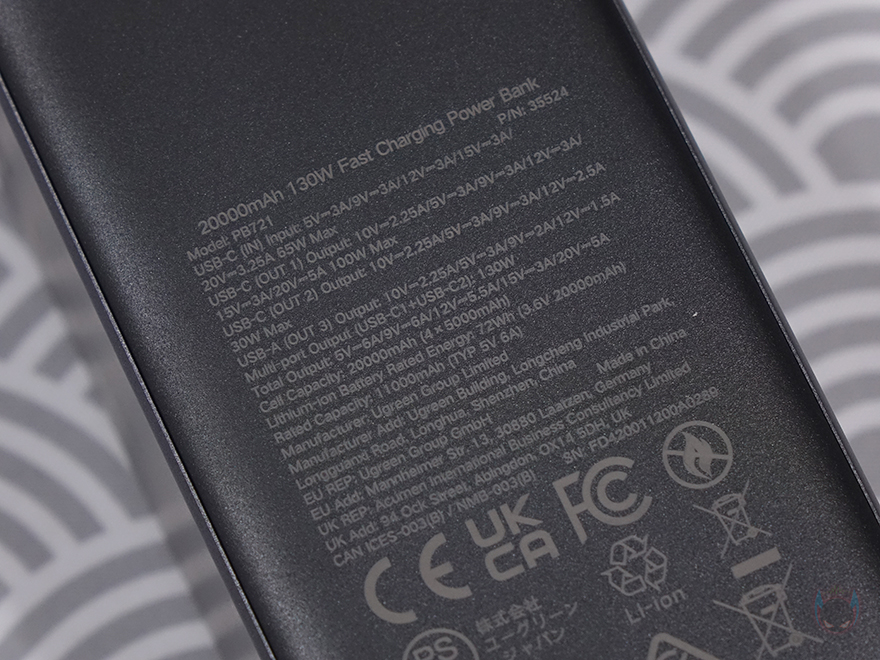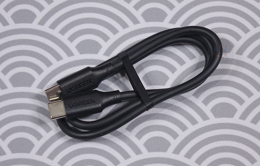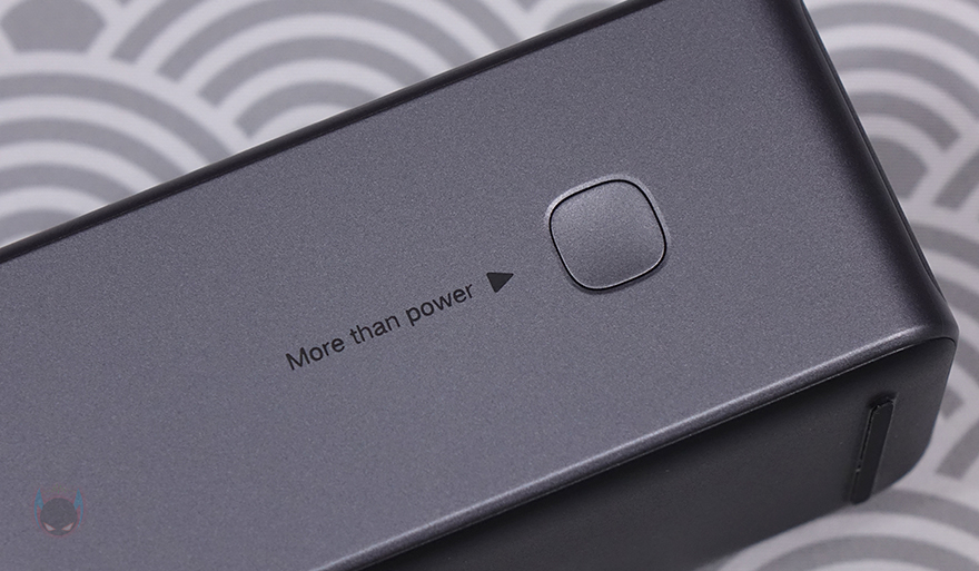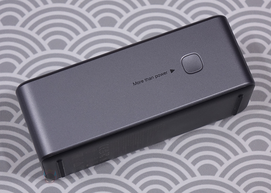 오른쪽 측면에는 버튼이 하나 배치되어 있는데, 바로 전원 버튼으로 버튼 옆에 문구처럼 단순 전원 버튼 기능만 하는게 아니라 추가 기능도 갖추고 있습니다. 이 부분은 뒤에서 다시 언급하죠. 그리고, 반대쪽 측면에는 총 출력과 배터리 용량 표기를 확인할 수 있으며, 후면에는 포트별 전력 출력과 입력 지원을 확인할 수 있는데, USB 타입 C 1번 포트 같은 경우에는 출력 시 최대 100W까지 지원하며, 보조배터리 충전 즉 입력 시에는 최대 65W로 충전됩니다. 또한, 후면에는 미끄럼방지를 위해 위아래 고무패드도 기본 부착되어 있죠. 끝으로, 기본 제공되는 USB 충전 케이블은 약 50cm 길이에 USB Type-C to C 인터페이스를 가졌습니다.
