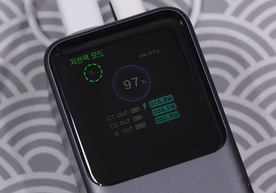 그리고, Nexode 130W 보조배터리로 외부 디바이스 장치들을 충전해보면, 충전에 사용되는 포트는 바로 화면에서 충전속도를 확인할 수 있습니다. 또한, 충전 작동일 때 전원 버튼을 한 번 누르면 전압과 전류 표기와 함께 실시간 그래프 형태로도 볼 수 있습니다. 물론, 충전 포트가 총 3개이기 때문에 사용하는 포트에 맞춰서 모두 화면에 보여주죠. 기존에 보조배터리들은 충전 속도나 단순 전압/전류 표기까지는 있었지만, 그래프 방식까지 나오는 경우는 매우 드물고, 유그린에서도 첫 제품이죠. 여기에 무선이어폰이나 스마트워치 같은 저전력으로 충전하는 디바이스 제품들도 앞서 언급했듯이 전원버튼을 3초 이상 누르면, 화면에 왼쪽에 ^ 표시가 나오면서 저전력 모드로 충전할 수 있으며, 퍼센트 잔량 표기 오른쪽 위에는 실시간으로 몇 시간 사용할 수 있는지도 표시해 줍니다. 또한, 전원 버튼을 30초 이상 건드리지 않으면 자동으로 디스플레이 화면은 로봇 이모티콘 화면으로 바꿔 디스플레이에 따른 배터리 소모도 줄이도록 했으며, 추가로 30초 이상 또 건드리지 않으면 화면 밝기도 자동으로 줄이죠.