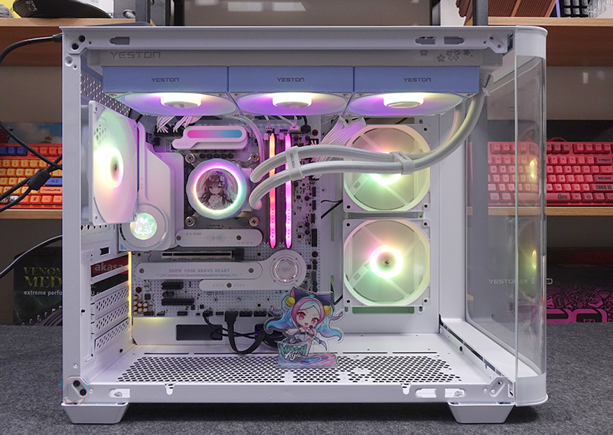 직접, MAXSUN(맥선) iCraft B760M CROSS 메인보드를 사용해보면, 일단 5V와 12V RGB 헤더를 갖추고 있기 때문에 주변 부품들이 RGB Sync를 지원하면, MAXSUN의 RGB Sync와 연동해 사용할 수 있습니다. 그리고, 앞서 확인한 전원부 히트싱크 부분에는 전원이 켜지면 디스플레이 부분에 캐릭터가 나타나고, 캐릭터 배경으로도 RGB 라이트 효과가 적용되는 것을 확인할 수 있습니다.
