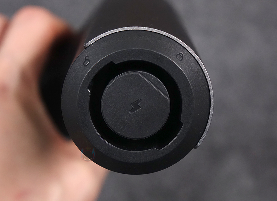 뒤집어서 아랫쪽을 보면, 45도 각도의 앞부분에는 내부에 회전 모터가 있는 부분이자 함께 제공되는 브러시들이 장착되는 브러시 헤드(Brush head)가 적용되어 있는데, 라운드형 사각 디자인에 뒤쪽 테두리 부분으로 IPX7 방수 표시를 확인할 수 있습니다. 즉, 1m 물 깊이까지는 방수가 된다는 거죠. 물론, 장시간 물에 담가놔도 된다라는 의미가 아니라 그냥 물로 청소해도 방수가 된다는 의미로 해석하는 게 좋습니다. 그리고, 뒤쪽 손잡이 아랫부분에는 다시 한번 제품의 기본 사양을 확인할 수 있는데, 내장된 배터리 용량은 4,000mAh, 충전속도는 10W입니다. 그리고, 손잡이 방향 본체 후면에는 충전 포트가 배치되어 있는데, 방수를 위해 덮개가 적용되어 있으며, 덮개를 벗기면 USB Type-C 포트를 확인할 수 있죠. 또한, 이 부분은 바로 뒤에서 확인하겠지만, 서서 사용하거나 높은 곳에 사용할 수 있게 제공되는 긴 막대와 연결되는 연결부로 잠금/해제 표시를 확인할 수 있습니다.