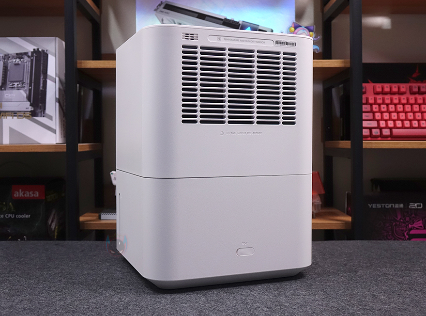 상하부가 연결된 상태에서 가습기 후면을 보면 역시 상부 후면에는 내부에 팬이 위치하고 있기 때문에, 이전 모델과 동일하게 후면 통풍구가 적용되어 있으며, 역시 통풍구 왼쪽 맨 위에 온도와 습도를 감지하는 센서가 배치되어 있죠. 그리고, 하부 물탱크 후면에는 역시 이전 모델과 동일하게 맨 아래에 전원어댑터와 연결되는 포트가 배치되어 있는데, 역시 고무마개가 적용되어 사용하지 않을 시 부식 및 먼지 유입이 되지 않도록 방지하고 있습니다. 또한, 하부 물탱크 오른쪽 측면에는 물 수위를 확인할 수 있게 투명 스트라이프가 적용되어 있습니다.