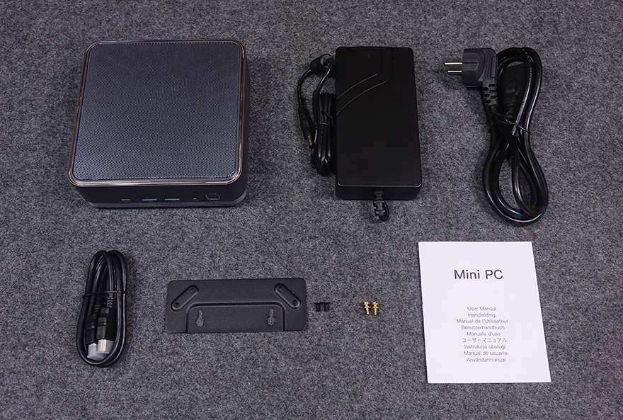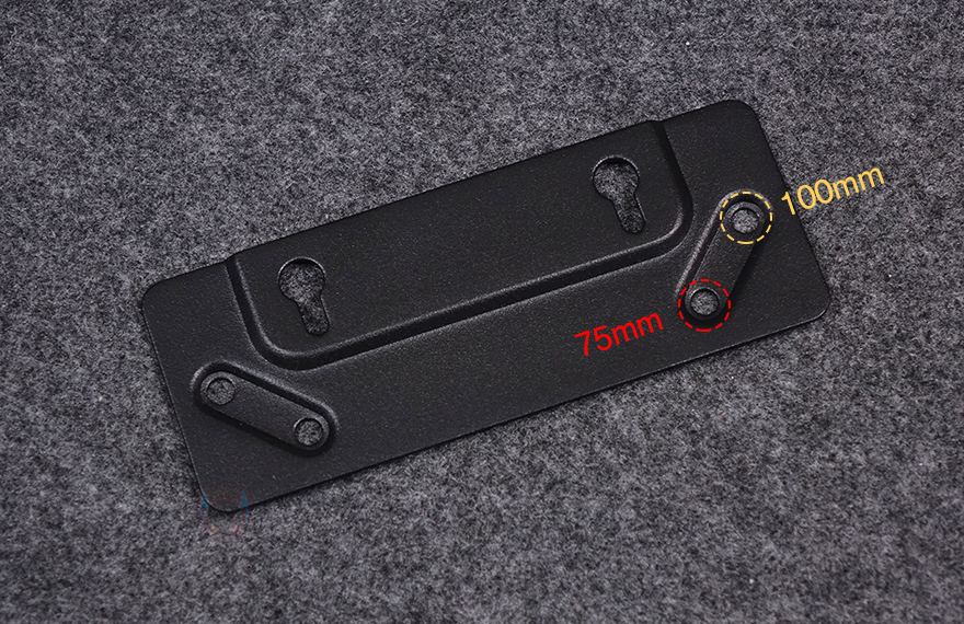 끝으로, F2M 미니PC는 모니터 후면에 장착할 수 있는 베사(VESA) 브래킷과 나사를 제공해 줍니다. 먼저, 제공되는 나사 중 금색 나사는 F2M 미니 PC 하단 중앙 에어홀 부근에 있는 나사홀에 결합해 줍니다. 이 나사는 베사 브래킷 구멍에 걸 수 있는 역할을 하죠. 그리고, 제공되는 베사 브래킷은 75mm와 100mm 나사홀이 있어서 모니터 후면 베사홀 규격에 맞춰서 장착을 해주면 됩니다. 베사 브래킷을 모니터 후면에 장착한 후에는 F2M 미니 PC를 브래킷에 걸면 후면 장착이 마무리됩니다. 물론, 사용하는 모니터 후면에 장착할 수 있는 구조일 때 이 키트를 사용해야 합니다. 그리고, 제공되는 전원어댑터는 최대 120W를 전력 공급을 지원합니다.