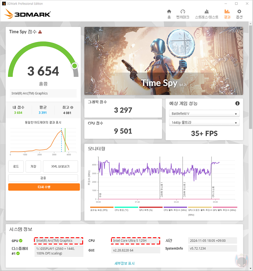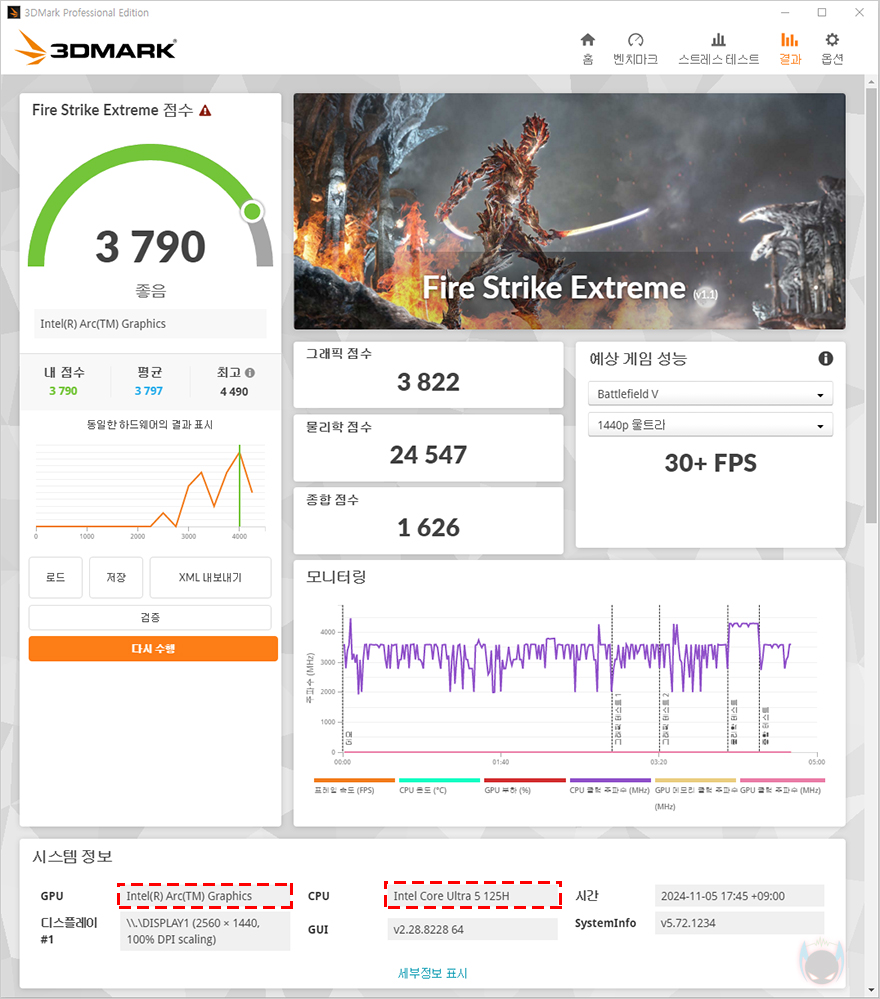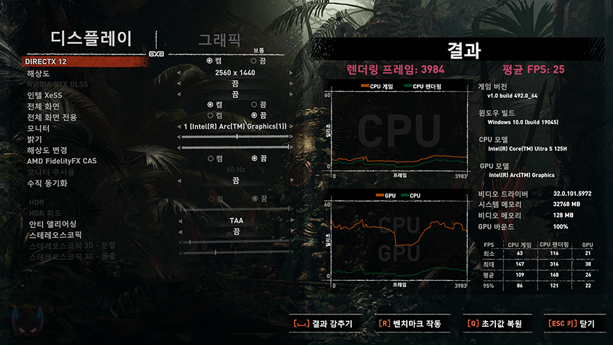 앞서 그래픽 성능에서 다이렉트X 12 기반에서 F2M 미니 PC의 인텔 코어 울트라 5 125H CPU에 내장된 아크 그래픽스가 가장 좋은 모습을 보여줬습니다. 그래서, 다이렉트X 12 기반의 게임 일부에서 성능 비교를 해봤는데, 게임에 따라서 아크 내장그래픽스가 가장 앞서는 경우도 있고, 라데온 780M 다음으로 나은 성능을 보여주는 경우도 있었습니다. 그래서, 아크 그래픽스가 라데온 680M보다는 확실히 우위에 있고, 라데온 780M과는 조금 아래 거나 비슷한 성능을 보여준다 할 수 있으며, 테스트는 QHD 해상도에서 진행했기 때문에, 내장 그래픽인 점을 고려했을 때, 풀-HD 해상도에서는 고사양 게임만 아니라면 옵션 타협을 통해 원활한 플레이를 할 수 있겠습니다.