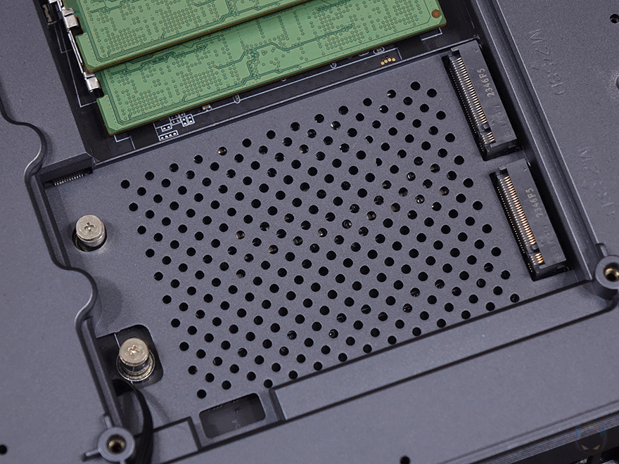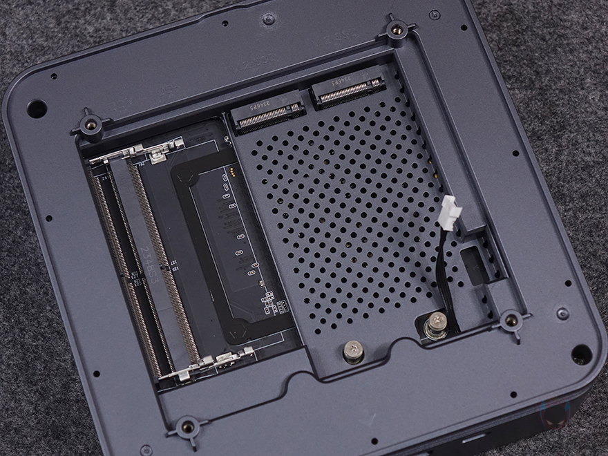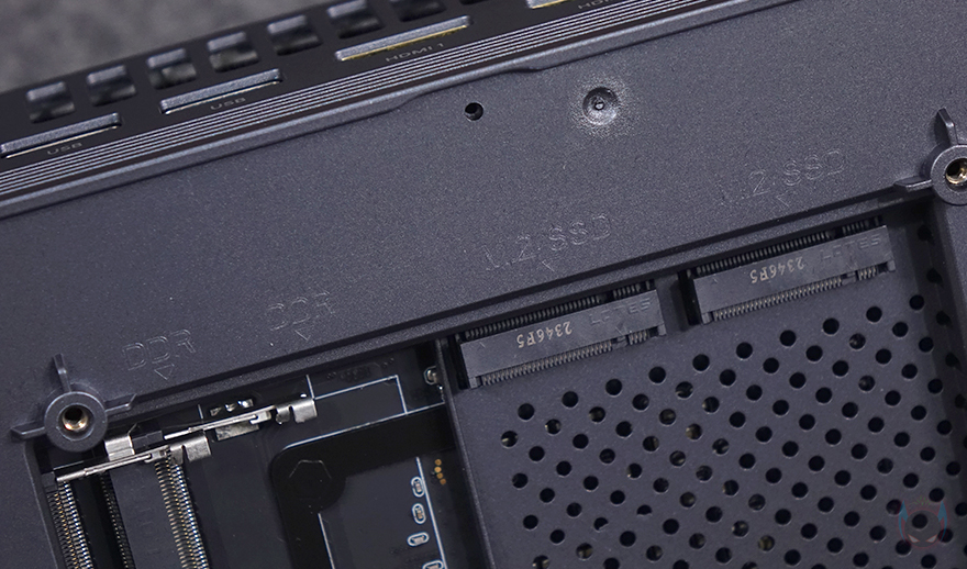 그리고, 커버가 분리된 본체 내부에는 베어본 옵션 구매시 메모리(RAM)와 저장장치(Storage)를 장착할 수 있는 슬롯들이 배치되어 있는데, 메모리 슬롯은 총 2개로 DDR5를 지원하며, 최대 5600 MHz 클럭과 최대 64GB 용량까지 갖출 수 있습니다. 저장장치는 SSD 슬롯으로 2개의 슬롯 모두 PCIe 4.0 규격을 지원합니다.