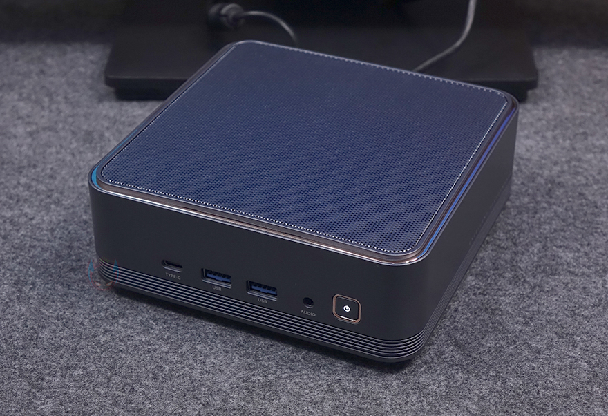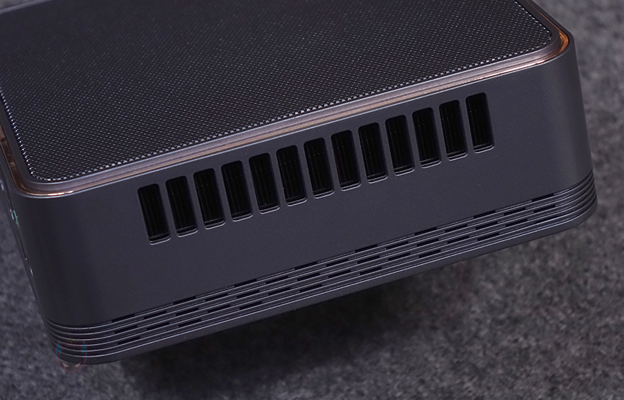 부위별로 좀 더 자세히 살펴보면, 전면에는 버튼 및 포트가 배치되어 있는데, 맨 오른쪽에 전원 버튼(Power button) 역시 본체와 비슷한 디자인으로 메탈 그레이 색상에 포인트로 로즈 골드 색상 라인을 적용했죠. 그 옆으로 3.5mm 오디오 포트, USB 3.2 Gen1 Type-A 포트 2개, USB 3.2 Gen2 Type-C 포트순으로 배치되어 있습니다. 그리고, 오른쪽 측면에는 하부에 콘셉트 문구와 함께 라인 디자인 부분에 에어홀 처리를 일부 적용했으며, 반대쪽 왼쪽 측면에는 내부 CPU 발열 해결을 위한 쿨러 위치로 열이 배출될 수 있게 에어홀 처리가 되어있는데, 근접해서 보면 내부에 방열핀도 일부 확인이 되죠. 본체 상단 역시 외부 공기 유입이 되도록 메쉬(Mesh) 디자인을 적용하고 있습니다.