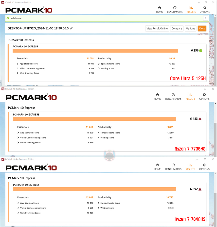 이번엔 내장그래픽 GPU의 성능을 확인해보면, Geekbench 6에서는 F2M의 미니 PC와 라이젠 7840HS 미니 PC의 내장그래픽 성능이 비슷한 결과를 보여줬으며, 3DMark에서는 다이렉트X 11 기반의 Fire Strike 익스트림에선 F2M 즉 아크 내장그래픽스가 라데온 780M 다음으로 좋은 성능을 보였으며, 다이렉트X 12 기반에서는 아크 내장그래픽스가 가장 좋은 성능을 보여줬습니다. 또한, 전체 시스템 성능으로도 비교했을 때, PCMark 10이나 PassMark PerformanceTest에서도 F2M 미니 PC가 라이젠 7840HS 미니 PC 다음으로 좋은 성능을 보여줬습니다. 그래서, 전체적인 성능으로 보면 F2M 미니 PC에 탑재된 인텔 코어 울트라 5 125H CPU는 AMD에서 첫 내장그래픽 성능을 올리기 시작한 라이젠 7735HS보다는 앞서고, 이후 2 세대라할 수 있는 라이젠 7840HS보다는 아래 거나 프로그램 환경에 따라서 비슷한 성능을 일부 보여줍니다.