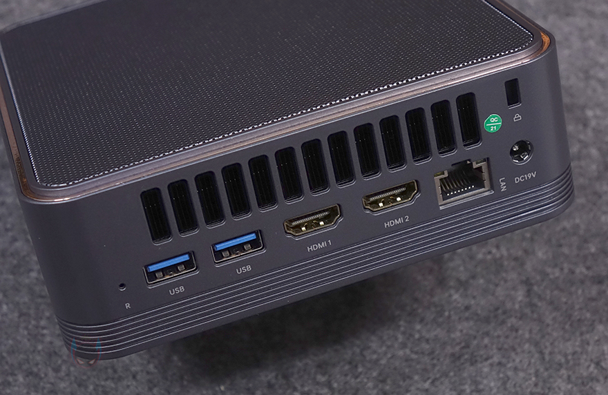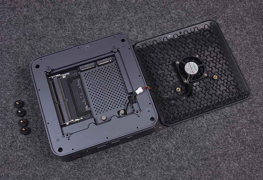 본체 후면에는 왼쪽 측면과 동일한 에어홀 처리에 아래로는 포트(Ports)들이 배치되어 있는데, 맨 오른쪽부터 DC 포트, 랜(LAN) 포트, HDMI 포트 2개, USB 3.2 Gen1 Type-A 포트 2개 순으로 배치되어 있으며, 맨 왼쪽에 리셋 버튼이 적용되어 있습니다. 본체 하단에는 중앙부분에 에어홀 처리와 함께 모서리 부근으로 받침대 역할의 패드가 장착되어 있는데, 나사형 패드 받침대(Screw Stand Pad)로 모두 풀면 하단 커버를 쉽게 분리할 수 있습니다. 분리하면 커버 안쪽 중앙 즉 외부에서 확인했던 에어홀 자리에는 40mm 팬이 장착된 것을 확인할 수 있는데 자동 속도조절 팬입니다.