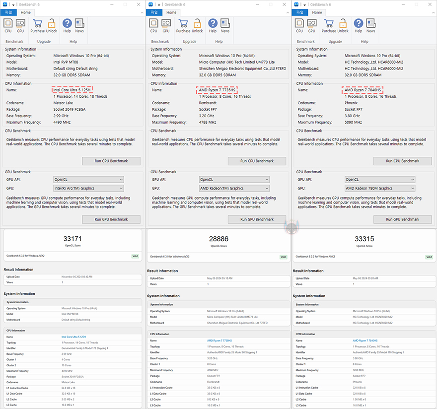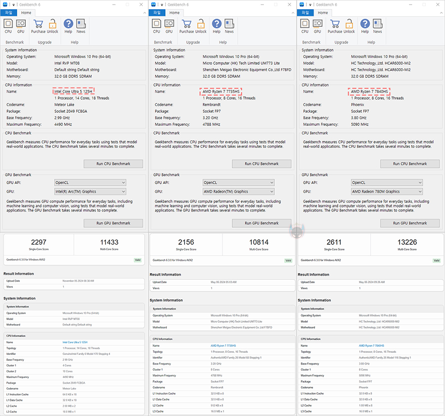 먼저 CPU 성능을 비교해보면, CPU-Z에 담긴 Bench 테스트로 간단히 확인했을 때, 싱글코어에선 F2M 미니 PC가 가장 앞섰고, 멀티코어 성능에서는 두 번째로 앞서는 걸 확인할 수 있습니다. 그리고, 추가로 CPU로 가장 많이 작업하는 렌더링방식의 Cinebench R23으로 싱글코어와 멀티코어 성능을 비교했을 때도 라이젠 7840HS 다음으로 좋은 성능을 보여줬는데, 두 성능 차이는 크지 않습니다. Geekbench 6에서도 역시 결과는 비슷했습니다.