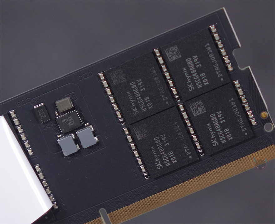 패트리어트(PATRIOT) SIGNATURE LINE 노트북용 DDR5-5600 32GB 메모리를 살펴보면, 일단 SIGNATURE LINE 노트북용 DDR5는 단일 32GB, 16GB, 8GB 3가지 용량을 갖추고 있으며, 가장 큰 용량은 32GB이며, 메모리 라벨 스티커에서 5600 MHz 클럭표기를 확인할 수 있습니다. 그리고, PCB기판은 블랙 색상이며, 앞뒤로 모두 모듈이 장착된 양면형이며, DDR5에서부터 적용되는 전압관리 칩셋 PMIC를 라벨 스티커를 벗기면 확인할 수 있습니다. 참고로, PMIC 칩셋은 Richtek사이며, 메모리 모듈은 SK 하이닉스가 적용되었습니다.