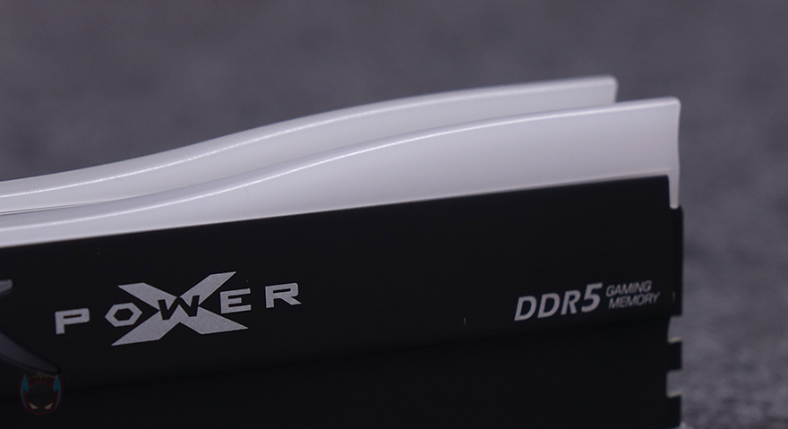 그럼, 실리콘파워(SiliconPower) STROM RGB DDR5 메모리 외형을 살펴보면, 앞서 언급했듯이 방열판 색상에 따라 블랙(Black)과 화이트(White) 2가지 색상으로 출시되었습니다. 방열판 디자인은 상단 RGB 라이트닝 효과를 볼 수 있는 LED 바를 기준으로 좌우 비대칭형 디자인이며, 방열판 중앙에 XPOWER 로고와 함께 바로 오른쪽에는 방열판 일부에서도 라이트닝 효과 노출이 되도록 디자인처리 되어있죠. 방열판을 분리하지 않아도 PCB기반이 블랙색상이라는 걸 측면에서 쉽게 확인할 수 있고, 상단 LED 바 한쪽에는 XPOWER DDR5 표기를 해놨으며, 반대쪽은 높이가 더 올라간 지느러미가 연상되는 디자인을 가졌습니다.