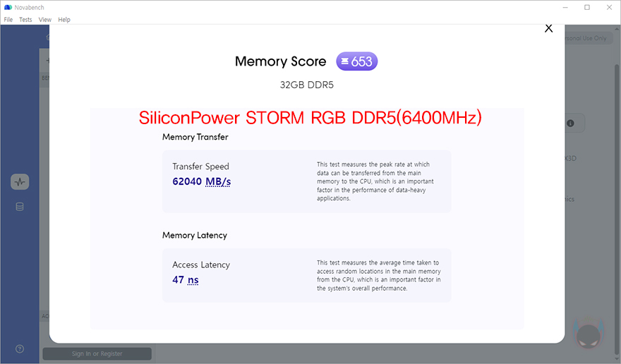 그럼, 기본작동 클럭인 4800MHz와 XMP 프로파일의 설정값 6400 MHz 클럭으로 STORM RGB DDR5 메모리의 성능을 비교해 보면, AIDA64 Cache&Memory Benchmark, MaxxMEM, Novabench Memory Test, Passmark PerformanceTest Memory Mark까지 메모리 위주의 벤치마크 프로그램들로 실행 비교해 본 결과 모두 XMP 프로파일값의 6400 MHz 클럭이 좀 더 나은 성능을 보여주는 걸 확인할 수 있습니다. 메모리 오버클럭을 할 줄 모르거나 초보자인 사용자들은 XMP 프로파일로 쉽게 성능향상을 할 수 있는 효과를 그대로 보여줍니다.