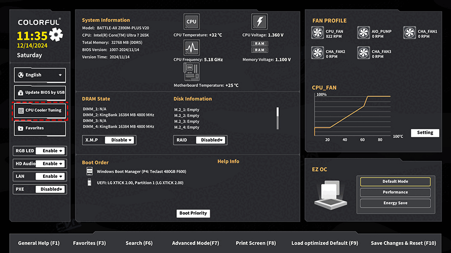 직접, 컬러풀 Battle-AX Z890M-Plus V20 메인보드를 사용해보면, 먼저 바이오스 CMOS를 잠깐 살펴보면 일단 인터페이스 디자인이 완전히 바뀌었습니다. 정확히는 이제 흔히 말하는 4대 메이저 메인보드 회사들이 적용하고 있는 인터페이스 형식으로 적용된 거죠. 참고로, 최신 바이오스로 업데이트하면 색상 부분까지 좀 더 깔끔하게 변경된 인터페이스를 볼 수 있습니다. 그리고, 기본화면에서 4대 메이저 메인보드 제품들처럼 컬러풀도 이제 EZ Mode와 Advanced Mode로 전환할 수 있는데, 일단 EZ Mode라 할 수 있는 기본화면에서는 한눈에 시스템 상태와 메모리, 팬, 부팅, RGB, 바이오스 업데이트, 언어 설정 등을 한눈에 확인하고 설정할 수 있습니다. 경쟁사들보다 훨씬 심플한 배경을 적용하고 있어서 보기에도 깔끔하죠. 또한, EZ Mode에선 CPU Cooler Tuning 메뉴가 있는데, 장착한 쿨러 종류에 따라서 CPU PL1, PL2 전력설정을 자동으로 적용할 수 있습니다. 쉽게 말해, 인텔에서 코어 울트라 2 시리즈 CPU를 출시하면서 언급했던 성능 퍼포먼스에 대한 프로파일 제공을 CPU Cooler Tuning 메뉴에 적용한 거라고 보면 됩니다. F7키를 통해 전환할 수 있는 Advanced Mode는 다른 메인보드에서도 흔히 볼 수 있는 세부설정의 메뉴들 System, OC, Advanced, Boot, Monitor, Tool, Exit를 확인할 수 있습니다. OC는 CPU/메모리 오버클럭 관련을 설정할 수 있으며, Advanced에선 전력, 저장장치 등 메인보드에 연결되는 전반적인 하드웨어 설정을 다룰 수 있습니다.