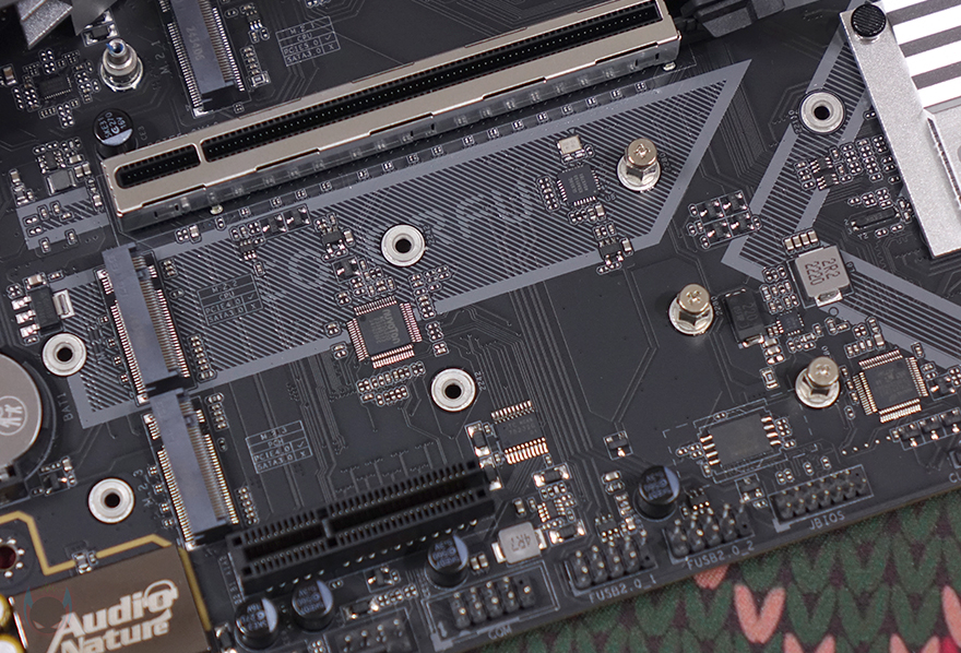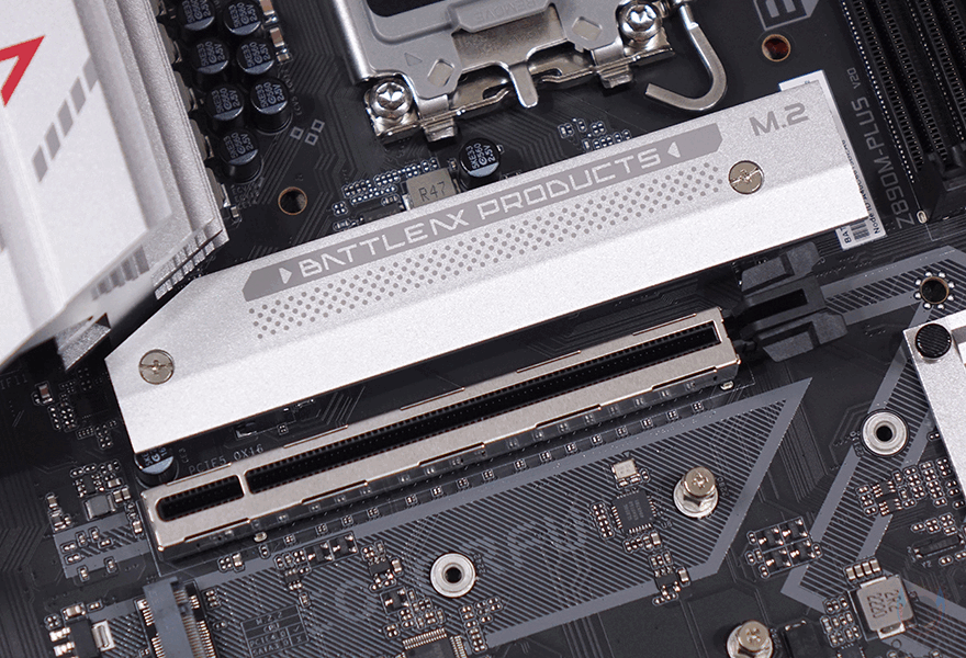 PCI 슬롯은 2개를 구성하고 있으며, 그래픽카드 장착되는 1번 PCI 슬롯은 PCIe 5.0x16 지원을 하며, 나머지 하나의 슬롯은 PCIe 4.0x4 규격을 지원합니다. 그리고, 1번 PCI 슬롯 바로 위에는 M.2 SSD 1번 슬롯이 배치되어 방열판과 함께 장착되어 있으며, 방열판을 분리하면 역시 2242/2260/2280 길이까지 장착할 수 있고, 방열판 안쪽에는 기본 써멀패드도 부착된 것을 확인할 수 있죠. 또한, 1번 PCI 슬롯 바로 아래에는 추가로 M.2 SSD 슬롯이 2개 더 배치되어 있으며, 하나는 2242/2280/22110까지 장착할 수 있으며, 나머지 하나는 2242/2280까지 장착할 수 있습니다. 또한, 바로 옆 Z890 메인칩셋이 위치한 방열판 바로 아래에도 M.2 SSD 슬롯이 배치되어 있으며, 역시 2242/2280 길이까지 장착할 수 있죠. 그래서, Battle-AX Z890M-Plus V20 메인보드에는 총 5개의 M.2 SSD를 장착할 수 있습니다.