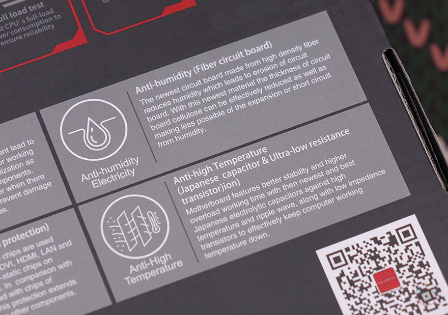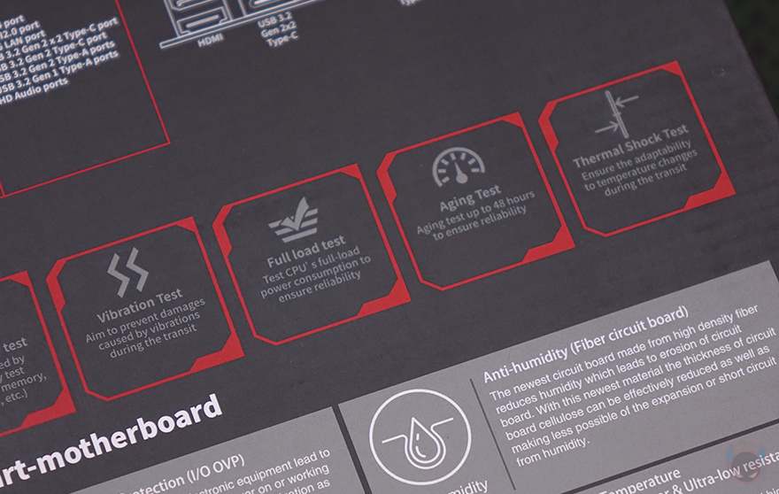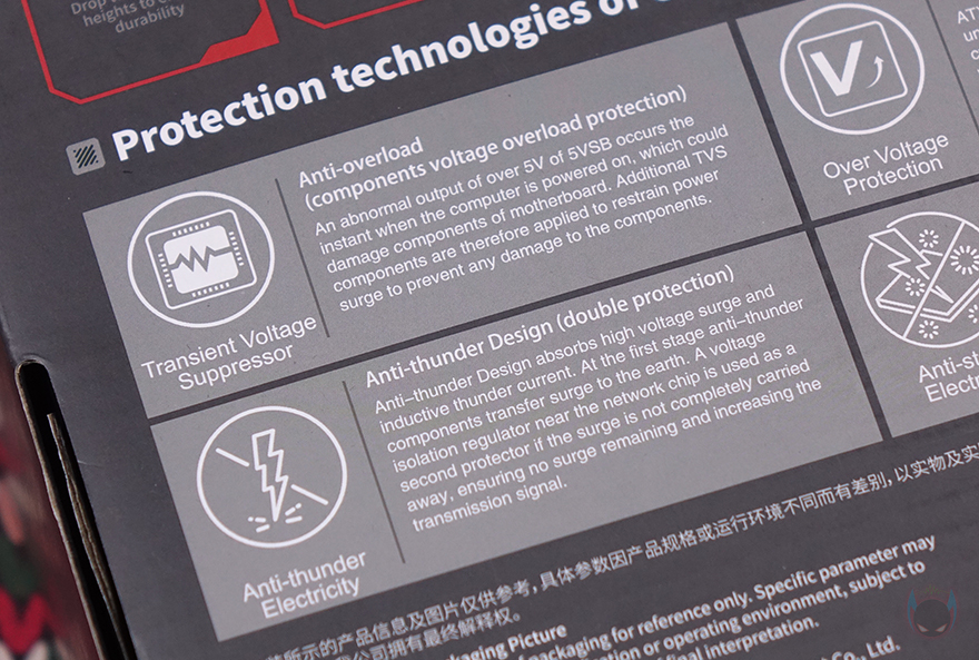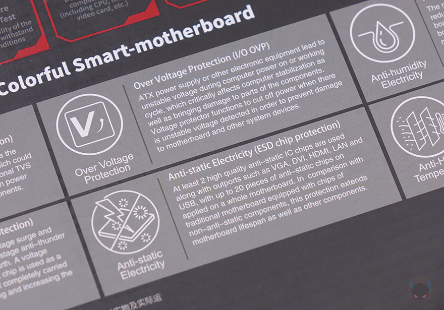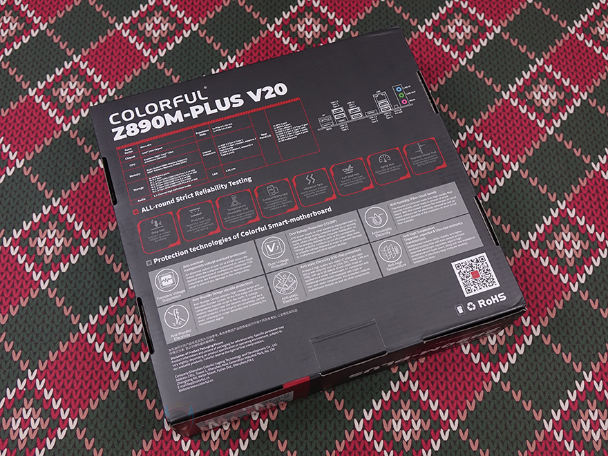 제품 박스부터 살펴보면, 박스에 제품 이미지를 따로 없으며 전면에 모델명을 큼지막하게 표기해놨습니다. 물론, 아래에는 이번 인텔 코어 울트라 시리즈 2(Core Ultra Series 2) CPU 소켓과 지원, Z890 칩셋 표기도 확인할 수 있으며, 추가로 PCIe 5.0 지원, 컬러풀의 통합 소프트웨어 iGame Center 지원표기도 확인할 수 있죠. 박스 후면에는 제품의 기본 사양 표기와 함께 좀 더 다양한 정보를 확인할 수 있는데, 기본 사양 표기 바로 옆에는 추가로 백패널 I/O 포트 표기를 해놨으며, 아래로는 컬러풀에서 진행한 안전 테스트 8가지 표기와 컬러풀에서 항상 강조하는 6가지 보호기술 언급을 담고 있습니다. 안전 테스트에는 낙하(Drop)부터 연결(Plug), 온도(Temperature), 호환(Compatibility), 진동(Vibration), 풀-로드(Full-load), 노화(Aging), 열충격(Thermal shock)을 통과했으며, 6가지 보호기술은 과전압보호/고발열보호/정전기보호/낙뢰보호/습기보호/전력과부하보호를 말합니다.