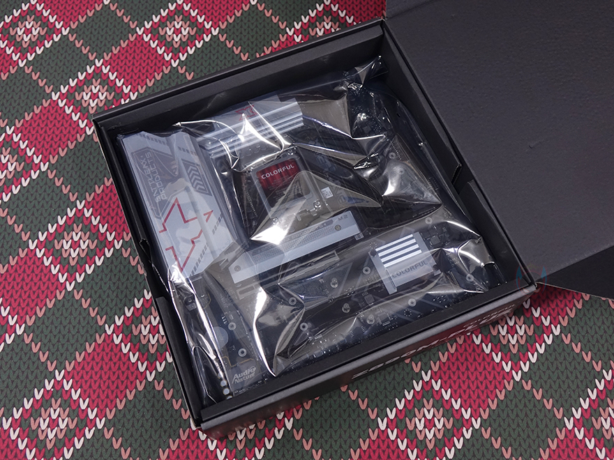 박스를 열어보면, 메인보드 포장을 먼저 확인할 수 있으며, 다른 메인보드 제품들과 마찬가지로 정전기보호비닐 포장으로 처리되어 있습니다. 제품 구성에는 Battle-AX Z890M-Plus V20 메인보드, SATA 케이블 2개, Wi-Fi 안테나 모듈 및 나사, 제품설명서로 이루어져 있습니다. 보급형 제품이라 가장 기본적으로 필요한 구성만 갖추고 있습니다.