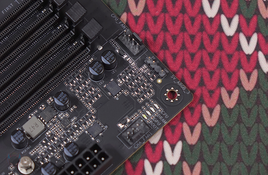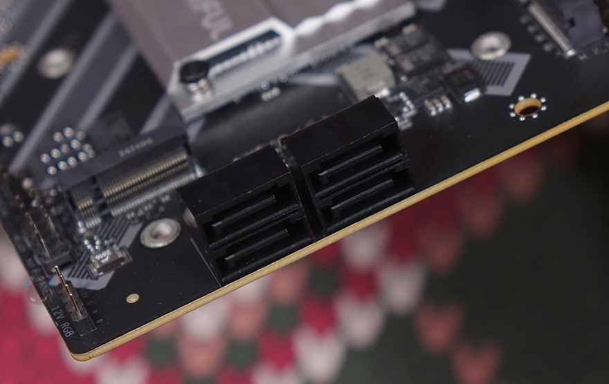 메모리 슬롯은 4개 구성으로 총 192GB 용량을 지원하며, 논-바이너리 용량도 단일 48GB까지 지원합니다. 또한, 메모리 오버클럭도 8400MHz까지 지원하며, 슬롯 주변으로는 5V ARGB 헤더와 부팅 상태를 체크하는 디버그(Debug) LED가 적용되어 있으며, M.2 SSD 슬롯도 앞쪽에 1개 장착할 수 있게 배치 적용된 것을 확인할 수 있죠. M.2 SSD 슬롯은 2242/2260/2280 길이까지 장착할 수 있으며, 슬롯 바로 옆에는 추가로 USB 3.2 Gen2 Type-C 헤더와 USB 3.2 Gen1 헤더 배치를 확인할 수 있습니다. 그리고, 같은 위치 맨 아래 그러니깐 메인보드 맨 오른쪽 아래에는 S-ATA 6 Gbps 커넥터 4개가 적용된 것을 확인할 수 있죠.