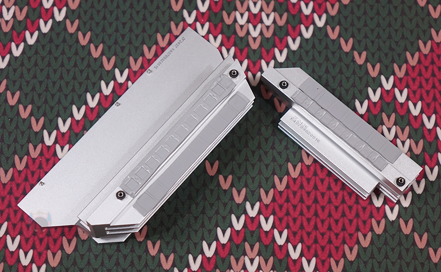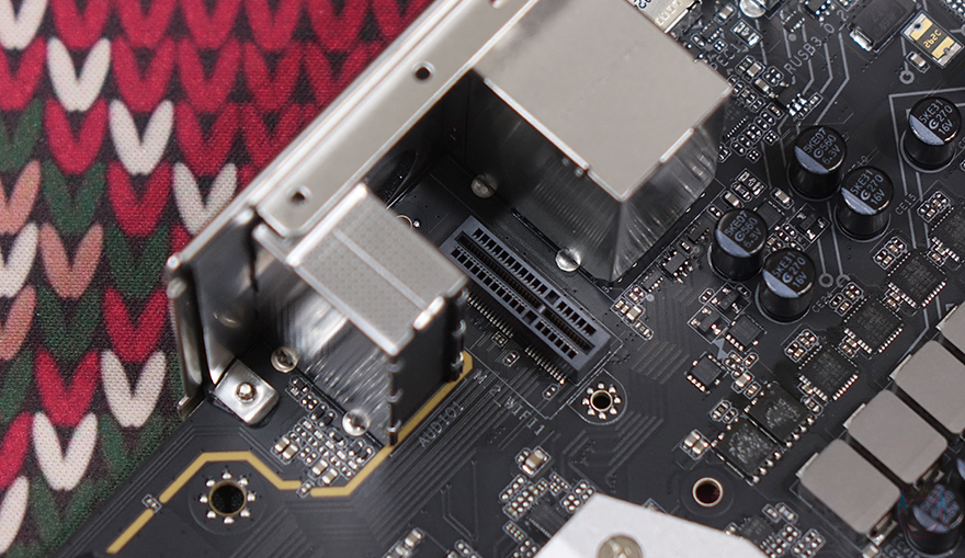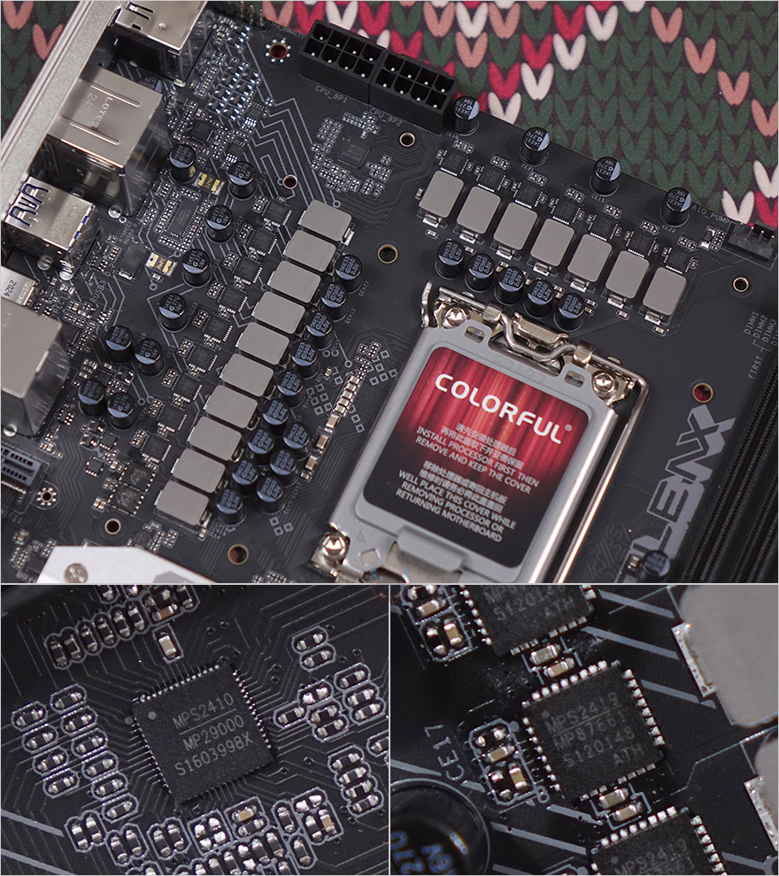 그리고, CPU 소켓 주변 전원부에는 방열판(Heatsink)이 장착되어 있으며, 백패널 방향쪽 방열판에는 BATTLAX 문구를 새겨놨으며, 방열판들을 분리하면 안쪽에 모스펫과 초크 발열해결을 위해 기본 써멀패드(Thermalpad)가 부착된 것을 확인할 수 있습니다. 전원부는 14+1+1+1 구성에 총 17-페이즈(Phase)로 모스펫은 MPS사의 Dr.MOS로 개당 최대 60A 전력공급을 지원하며, 컨트롤칩셋(PWM) 역시 MPS사 칩셋을 사용했습니다. 참고로 MPS사 칩셋은 4대 메이저라 부르는 메인보드 회사들도 주로 사용하고 있습니다. 그리고, CPU 보조전원은 8핀 2개를 구성하고 있으며, 방열판을 분리했을 때 백패널 I/O 부분에 M.2 WiFi 슬롯을 확인할 수 있는데, Wi-Fi 모듈만 있으면 기본제공되는 안테나 모듈과 함께 사용해 Wi-Fi 구성도 사용자가 할 수 있습니다.