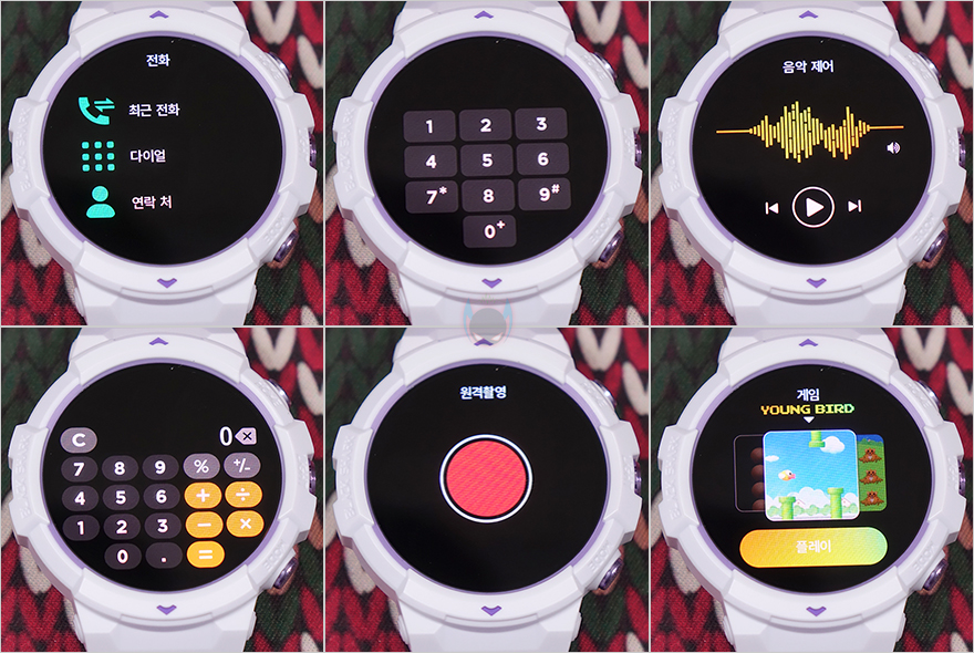 이 밖에 GS3 SPORT 스마트워치에는 블루투스 전화통화 기능도 연락처부터 다이얼방식까지 갖추고 있으며, 스마트폰에서 음악 재생을 틀면, 스마트워치에서 재생컨트롤을 할 수 있고, 계산기 기능, 카메라 셔터 연동, 스마트워치 자체에서 간단히 즐길 수 있는 6가지 게임을 내장하고 있죠.