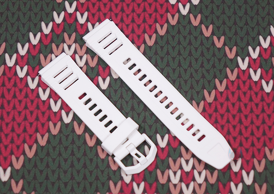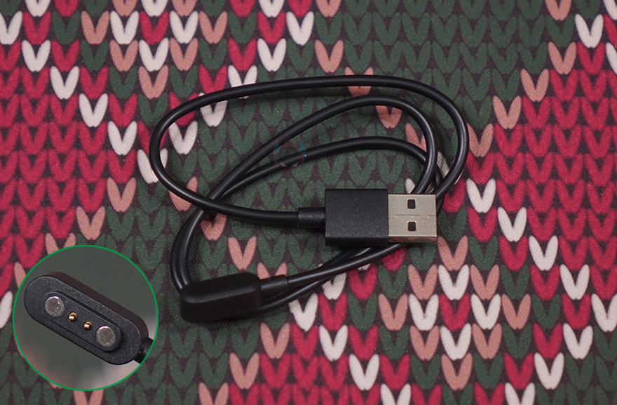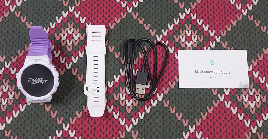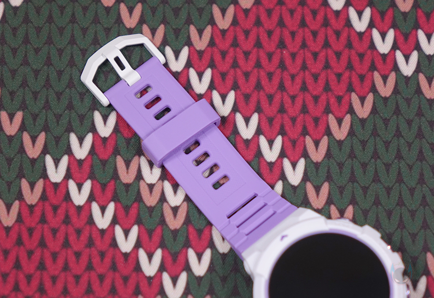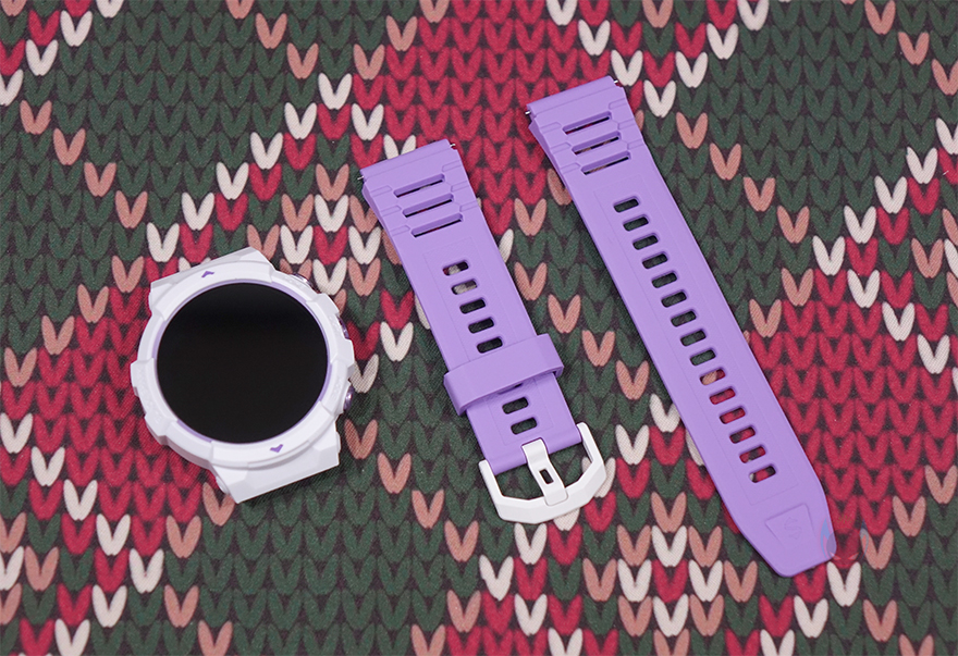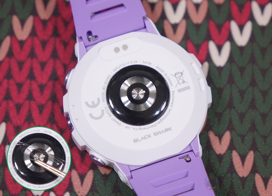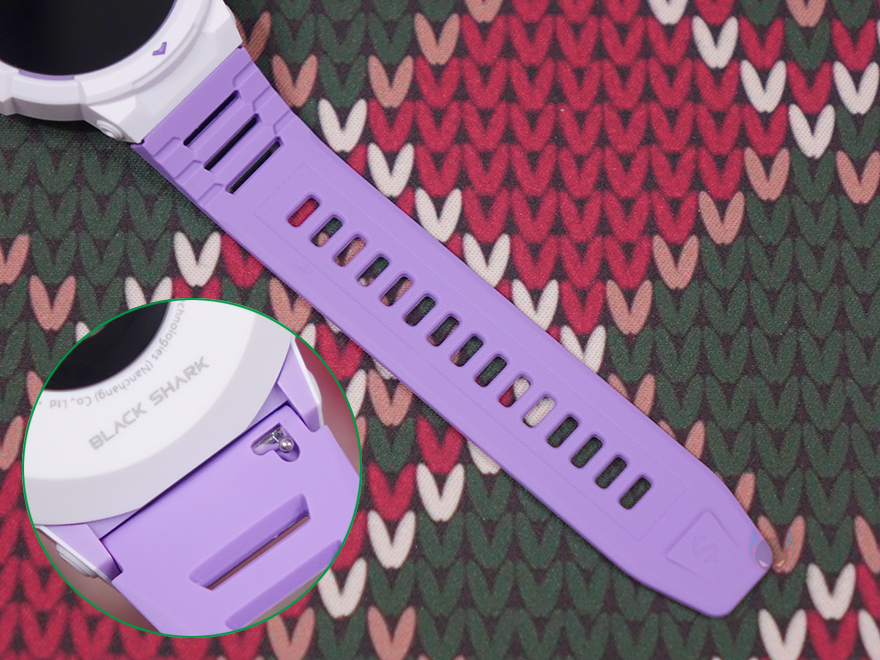 스트랩(Strap) 같은 경우에는 기본 장착된 스트랩 색상이 퍼플이며, 전형적인 시계 스트랩 타입이고 착용시 피부 자극이 없도록 실리콘 재질을 사용했습니다. 그리고, 착용시 손목조절을 할 수 있게 총 15개 구멍을 처리해놨죠. 그리고, 스트랩은 안쪽에 분리할 수 있도록 핀 방식을 적용하고 있으며, 핀을 안쪽으로 밀면 스트랩을 쉽게 분리할 수 있습니다. 루나 퍼플(Luna Purple) 모델 같은경우에는 추가 교체용 스트랩 색상이 화이트(White)이며, 기본 색상이 마음에 들지 않으면 교체해서 착용하면 됩니다. 개인적으로는 화이트 스트랩이 워치 케이스 색상과 동일되는 느낌이라 좀 더 낫지 않나 생각됩니다. 그리고, 제공되는 충전케이블은 전용 충전기로 방식은 다른 스마트워치 제품들과 마찬가지로 포고핀 방식입니다. 참고로, 블랙샤크가 샤오미 계열이라서 샤오미의 다른 스마트워치와 충전 호환이 되지 않을까 생각할 수 있지만, 전용 충전기라 호환되지 않습니다.
