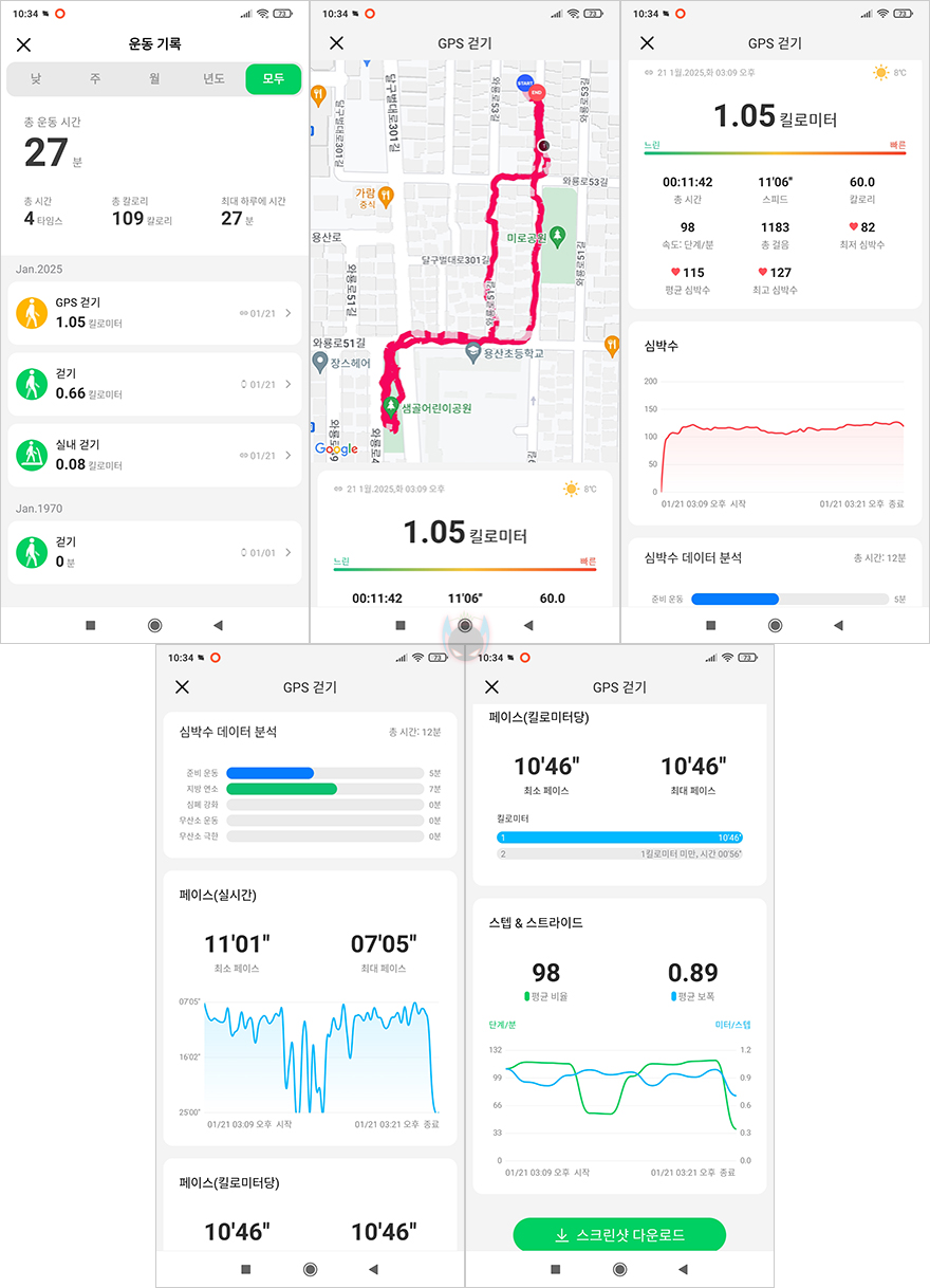 블랙샤크 GS3 SPORT 스마트워치의 주요 특징은 앞서 언급했듯이 먼저 나왔던 GS3보다 운동모드가 더 강화된 제품이라 좀 더 운동모드를 살펴보면, 스마트워치 자체에 다양한 운동모드를 내장하고 있습니다. 일단 기본목록에서 확인할 수 있는 운동모드는 5가지 GPS 운동모드를 비롯해 총 26가지 목록을 확인할 수 있으며, 이 중 다른 운동모드를 추가하고 있으면 삭제하면 됩니다. 추가할 수 있는 운동모드에는 총 10가지 대분류와 함께 대분류로 들어가면 다양한 운동모드들을 확인할 수 있고, 원하는 운동모드를 선택하면 추가됩니다. 참고로 GS3 스마트워치에는 100가지 이상이었고, GS3 SPORT 스마트워치는 20가지 이상 추가되어 120가지 이상 운동모드를 지원합니다. 그리고, GPS 운동모드를 선택해서 운동을 시작하면 Shark Fitlife 앱에서 운동기록을 경로부터 시작해서 거리, 심박수, 페이스, 스텝 등의 기록된 정보를 확인할 수 있죠.