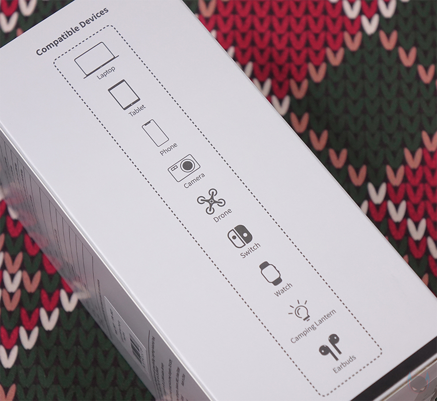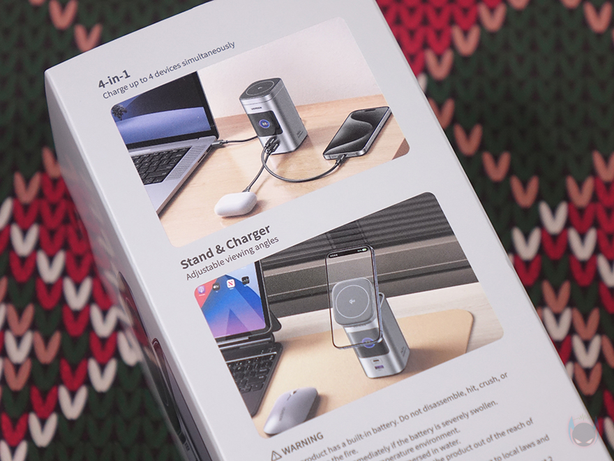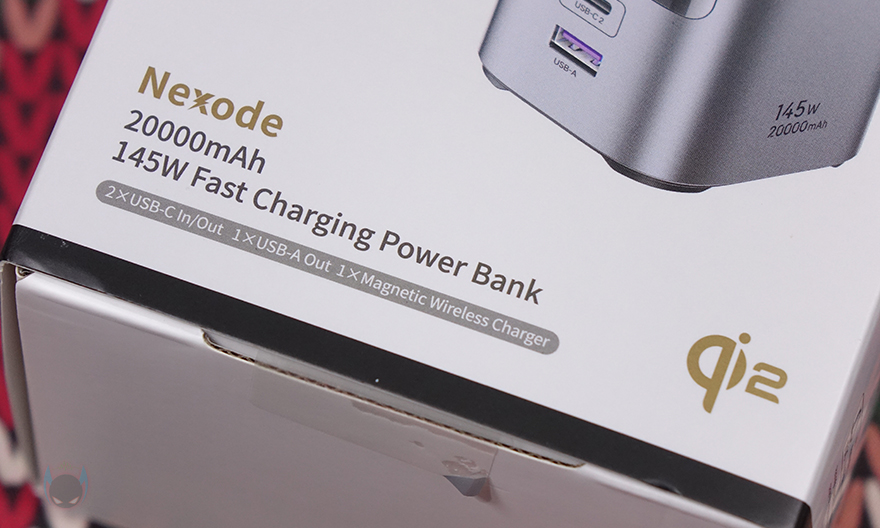 제품 패키지는 기존의 Nexode 라인업 보조배터리 제품들과 마찬가지로 박스 패키지이며, 속박스 포장에 겉에는 패키징 밴드 종이를 적용하고 있습니다. 밴드 종이 전면에는 제품 이미지가 실려있는데, 한눈에 봐도 유선과 무선 둘 다 충전 지원하는 제품임을 쉽게 알 수 있죠. 그리고, 이미지 바로 왼쪽에 주요 특징으로 무선 충전의 Qi2 규격 인증과 PD 3.0 규격의 100W 유선 충전 지원, 항공사 비행 승인, 다양한 플랫폼 충전 지원, 스마트 디지털 디스플레이 언급을 확인할 수 있는데, 앞서 만났던 Nexode 라인업의 130W(https://piscomu.com/314866), 200W(https://piscomu.com/314912) 보조배터리 제품과 동일한 언급입니다. 즉, 최근 Nexode 라인업의 보조배터리 특징에 무선 충전이 추가된 제품이 이번 모델이라고 보면 됩니다. 이미지 아래에는 용량과 총 충전 지원 출력과 Qi2 인증 마크를 추가로 확인할 수 있죠.