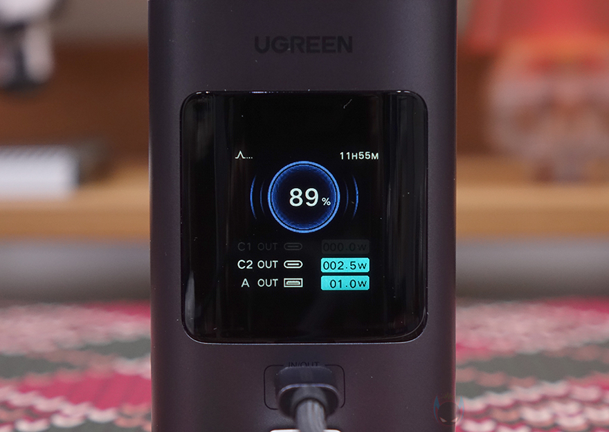 직접, 유그린(UGREEN) Nexode 145W 20000mAh 파워뱅크를 사용해보면, 후면에 배치된 전원 버튼을 누르면 바로 전면에 스마트 디지털 디스플레이에 화면이 켜지면서 기본 화면으로 배터리 잔량을 확인할 수 있습니다. 물론, 앞서 만났던 130W, 200W 모델과 마찬가지로 전원이 들어올 때 로봇 디자인의 이모티콘 확인이 먼저 나오고, 전원 버튼 사용법도 동일합니다. 전원을 켠 상태에서 버튼을 3초 이상 누르고 있으면 저전력 모드 전환으로 배터리잔량 숫자표기 왼쪽 위에 ^... 모드 표시를 해줍니다. 그리고, 전원 버튼을 6초 이상 누르고 있으면 전원이 꺼지는데, 이때도 로봇 디자인의 이모티콘이 나오죠.