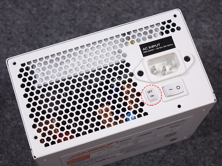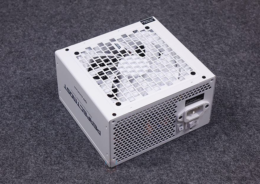 후면부 반대인 전면부에는 앞서 언급했듯이 퍼펙트모스트 시리즈 역시 UPMOST 시리즈와 마찬가지로 풀-모듈러 방식을 적용하고 있습니다. 그래서, 전면부에는 분리형 케이블들과 연결되는 커넥터들이 배치되어 있는데, 커넥터들마다 용도 표기를 해놔서 쉽게 구분할 수 있으며, UPMOST 시리즈에선 외관 색상과 상관없이 블랙색상의 커넥터가 적용되었는데, 이번 퍼펙트모스트 시리즈에는 외관 색상에 맞춰 커넥터도 통일시켰습니다. 그래서, 화이트 모델에는 화이트색상의 커넥터가 적용되어 있죠. 이밖에 본체 측면에는 모델명을, 본체 밑바닥 부분에는 다시 한번 제품의 기본 사양표기를 확인할 수 있습니다.