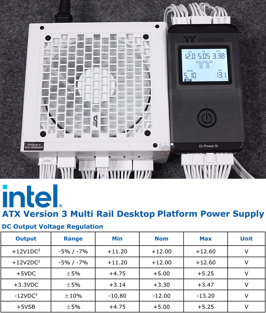 그럼, 다크플래쉬 퍼펙트모스트 750W 80Plus 골드 풀모듈러 ATX3.1 화이트 파워서플라이를 시스템 구성을 해서 사용해보는데, 그전에 기본 작동 그러니깐 각 전압의 출력상태를 확인해보면, 최신 인텔 파워서플라이 가이드(2.1a) 기준 범위에서 안정적으로 출력되는걸 확인할 수 있습니다. 그리고, 앞서 언급했던 후면에 배치된 에코팬 모드는 사용자가 환경에 따라 선택할 수 있는데, 에코팬 모드를 켜면 30% Load 상황전까지는 팬이 작동하지 않습니다. 반대로 에코팬 모드를 끄면 전원이 들어오는 동시에 팬이 작동하죠. 물론, 팬 작동은 내부 온도에 따라 자동속도조절합니다.