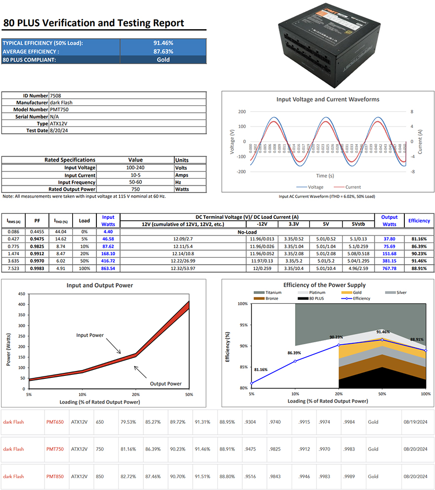 끝으로, 이번 퍼펙트모스트 시리즈 파워서플라이는 앞서 제품박스에서 확인했듯이 80Plus 골드등급 인증을 받았습니다. 실제 80Plus 공식홈페이지에 등록된 750W 용량의 퍼펙트모스트 750W 80Plus 골드 풀모듈러 ATX3.1 파워서플라이의 전력효율 테스트 결과를 확인해 보면, 평균 87.63%, 50% Load 상황에서 91.46%의 전력효율을 보여준 것으로 확인할 수 있어서 낭비되는 소비전력에 대한 걱정은 크게 하지 않아도 되겠습니다. 또한, 앞서 제품 설명서에서 잠깐 확인했듯이 국내외 시장에 아직 출시되지 않은 650W 용량 모델의 결과도 확인할 수 있어서 추후 출시 기대를 해볼 수 있겠습니다. 마지막으로 기본 작동상태에서 팬 소음을 근접상태에서 측정해 보면, 약 40dB(A) 수준으로 정숙한 편임을 확인할 수 있습니다. 실제 PC케이스 내부에 장착되면, 더 낮은 수준으로 들리고, 주변 다른 부품들의 쿨러 팬에 묻힐 정도의 소음이라 본 제품에 대한 팬 소음 걱정은 하지 않아도 됩니다.