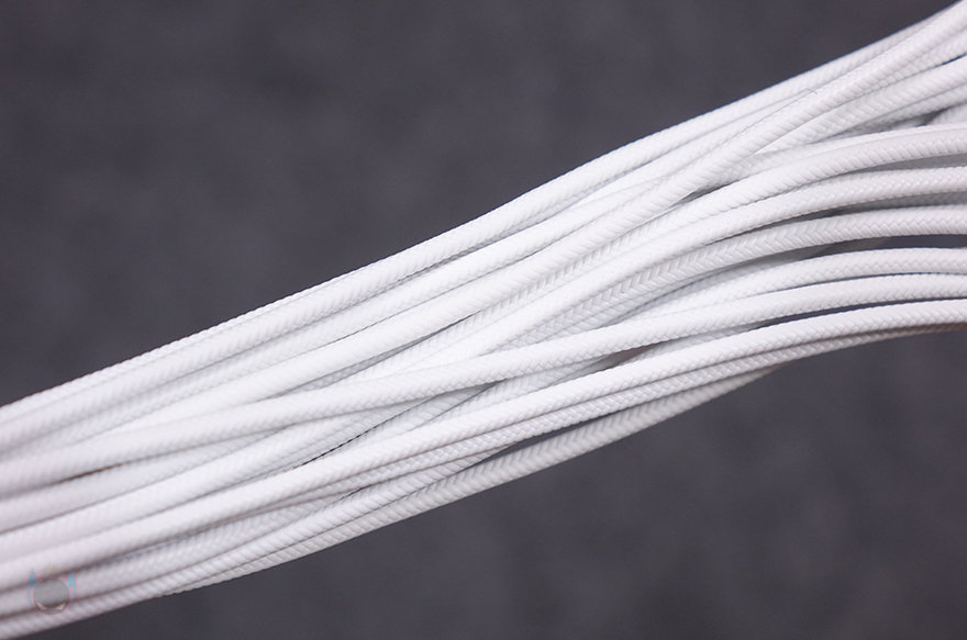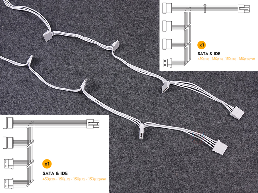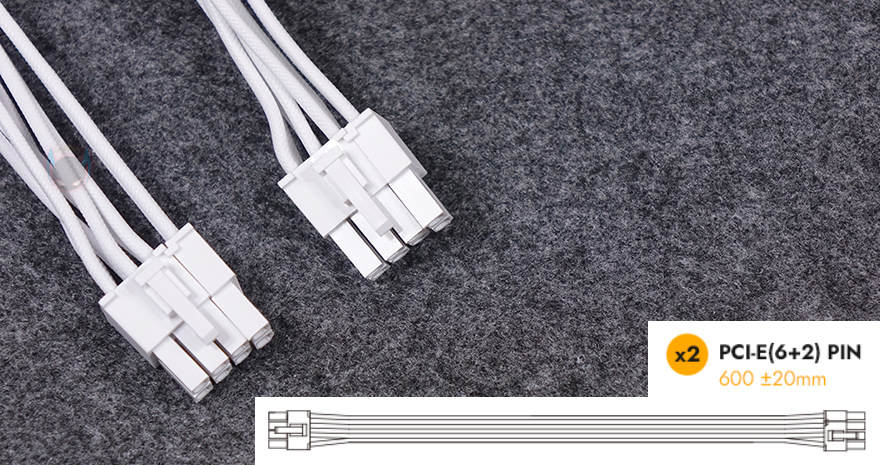 그리고, 퍼펙트모스트 750W 80Plus 골드 풀모듈러 ATX3.1 화이트 파워서플라이의 분리형 케이블은 총 8개 구성으로, 외관상으로 이번 제품에 가장 눈에 띄는 부분이기도한데, 바로 케이블 전선에 메쉬 패턴의 슬리빙이 처리된 케이블입니다. 기존 케이블들은 일자형으로 붙어있는 플랫타입이거나 기본 케이블 피복에 슬리빙이 처리된 방식 2가지정도였는데, 이번 퍼펙트모스트 시리즈에선 하이엔드 제품이나 커스텀 제작으로 판매되는 고급형 파워서플라이 케이블에서 볼 수 있는 가장 깔끔한 슬리빙처리방식의 케이블을 적용했습니다. 플랫타입보다 더 유연하면서도 피복+슬리빙 케이블보다는 얇죠. 그리고, 제품 색상에 맞춰서 커넥터 색상도 통일해, 화이트 모델에는 화이트색상 커넥터가 적용되었습니다. 이부분 역시 UPMOST 시리즈보다 개선된 부분이고, 케이블 전반적인 길이들도 요즘 PC케이스에 맞춘거라 충분한 길이를 가졌습니다.