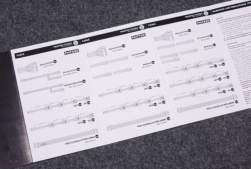 박스를 열어보면, 퍼펙트모스트 시리즈는 풀-모듈러 케이블을 적용했기때문에, 본체와 케이블 따로 분리 포장되어 있습니다. 본체 같은 경우에는 비닐포장과 함께 외부 충격방지를 위한 우레탄-폼 포장재를 사용했으며, 이외 케이블을 비롯한 나머지 구성품들은 별도의 전용 파우치로 보관 포장되어 있죠. 가격대비 상당히 신경 쓴 모습입니다. 제품 구성에는 퍼펙스모스트 파워서플라이 본체, 전원케이블, 나사, 케이블 연결 안내장, 소량의 케이블타이, 제품설명서, 분리형 케이블들로 이루어져 있습니다. 케이블 연결 안내장은 Nvidia 그래픽카드에 사용되는 PCIe 16핀 12-2x6 케이블 연결주의사항이며, 제품 설명서에는 750W, 850W 용량 외에 650W 용량 모델 정보도 있는데, 아직 국내/외 시장에 출시되지 않은 모델입니다. 그리고, 국내 정식 출시된 제품인 만큼 전원케이블은 KC인증을 받았고, 사용하지 않을 시 플러그 부식방지를 위한 마개도 함께 제공해주고 있죠.