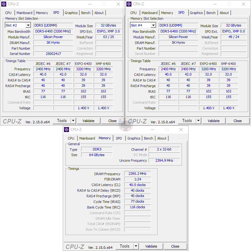 그리고, CPU-Z를 통해 리뷰에 사용된 XPOWER Pulse DDR5-6400 모델의 정보 및 작동클럭을 확인해 보면, 기본 작동클럭은 4800 MHz이며, 6400 MHz 클럭은 인텔 XMP와 AMD EXPO 프로파일로 적용되었다라는 걸 확인할 수 있죠. 그래서, 사용하는 메인보드에서 XMP나 EXPO 프로파일값을 불러오면, 손쉽게 6400 MHz으로 오버클럭 작동되는 걸 확인할 수 있습니다.